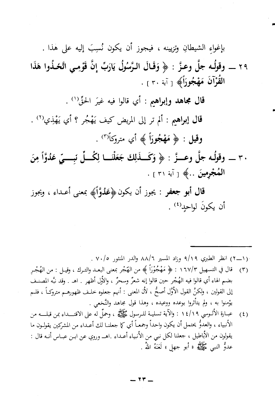 بإغواء الشيطان وتزيينه فيجوز أن يكون نسب إليه على هذا 29 - وقوله جل وعز وقال الرسول يا رب إن قومي اتخذوا هذا القرآن مهجورا آية 30 قال مجاهد وإبراهيم أي قالوا فيه غير الحق قال إبراهيم ألم تر إلى المريض كيف يهجر أي يهذي وقيل مهجورا أي متروكا 30 - وقوله جل وعز وكذلك جعلنا لكل نبي عدوا من المجرمين آية 31 قال أبو جعفر يجوز أن يكون عدوا بمعنى أعداء ويجوز أن يكون لواحد