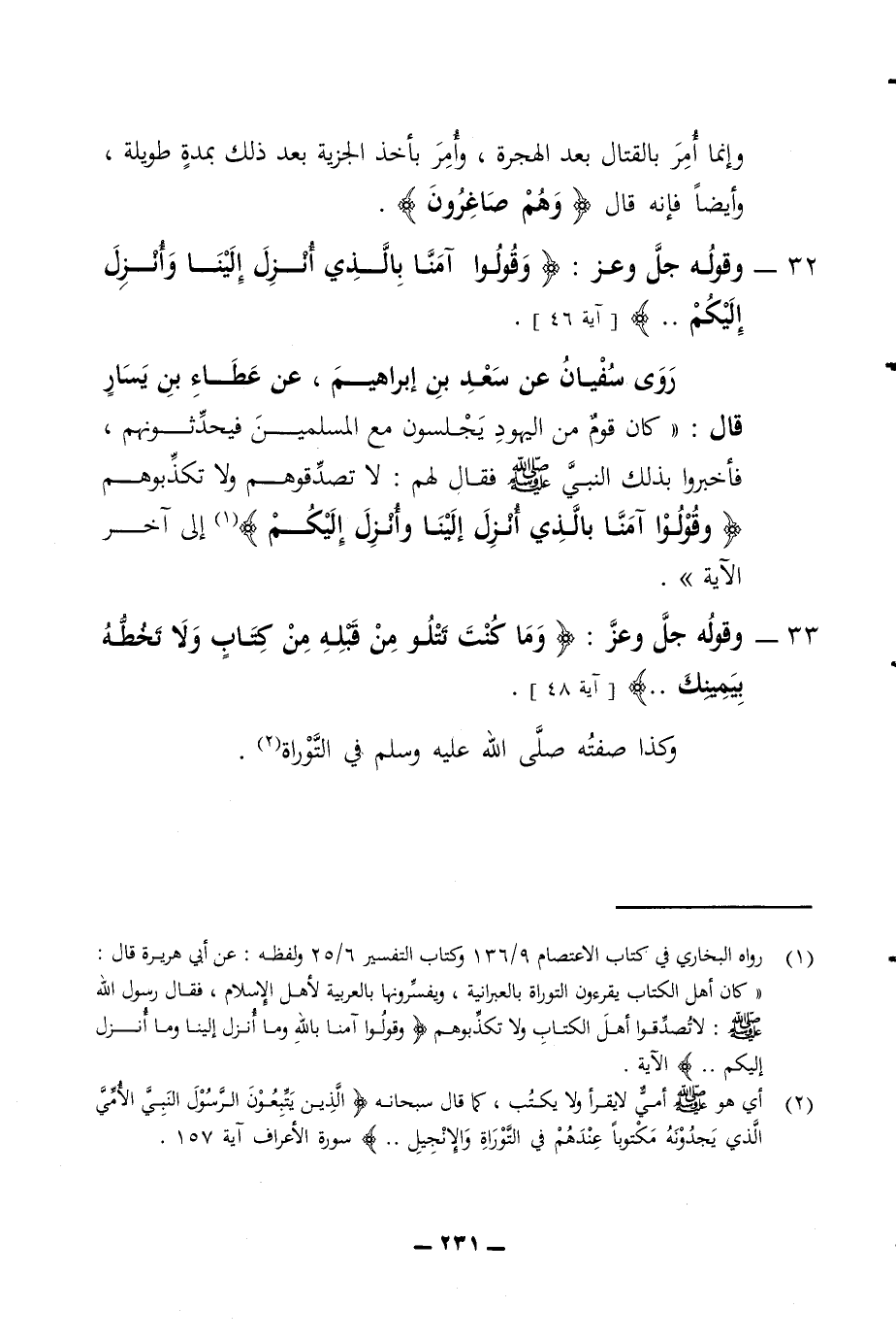 وإنما أمر بالقتال بعد الهجرة وأمر بأخذ الجزية بعد ذلك بمدة طويلة وأيضا فإنه قال وهم صاغرون 32 - وقوله جل وعز وقولوا آمنا بالذي أنزل إلينا وأنزل إليكم روى سفيان عن سعد بن إبراهيم عن عطاء بن يسار قال كان قوم من اليهود يجلسون مع المسلمين فيحدثونهم فأخبروا بذلك النبي صلى الله عليه وسلم فقال لهم لا تصدقوهم ولا تكذبوهم وقولوا آمنا بالذي أنزل إلينا وأنزل إليكم إلى آخر الآية 33 - وقوله جل وعز وما كنت تتلو من قبله من كتاب ولا تخطه بيمينك وكذا صفته صلى الله عليه وسلم في التوراة