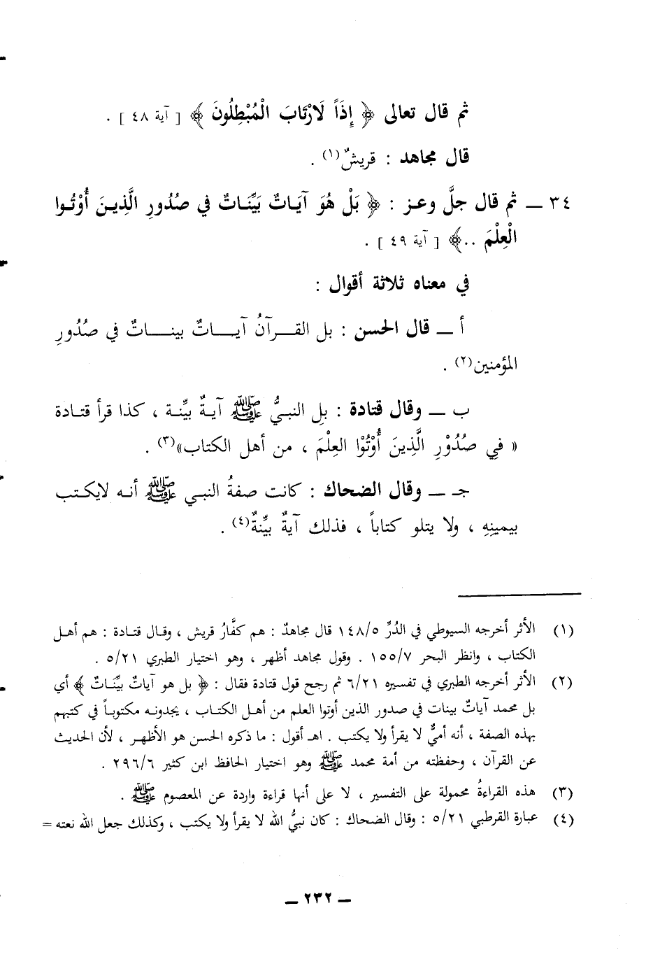 ثم قال تعالى إذا لارتاب المبطلون قال مجاهد قريش 34 - ثم قال جل وعز بل هو آيات بينات في صدور الذين أوتوا العلم آية 49 في معناه ثلاثة أقوال ا - قال الحسن بل القرآن آيات بينات في صدور المؤمنين ب - وقال قتادة بل النبي صلى الله عليه وسلم آية بينة كذا قرأ قتادة في صدور الذين أوتوا العلم من أهل الكتاب ج - وقال الضحاك كانت صفة النبي صلى الله عليه وسلم أنه لا يكتب بيمينه ولا يتلو كتابا فذلك آية بينة