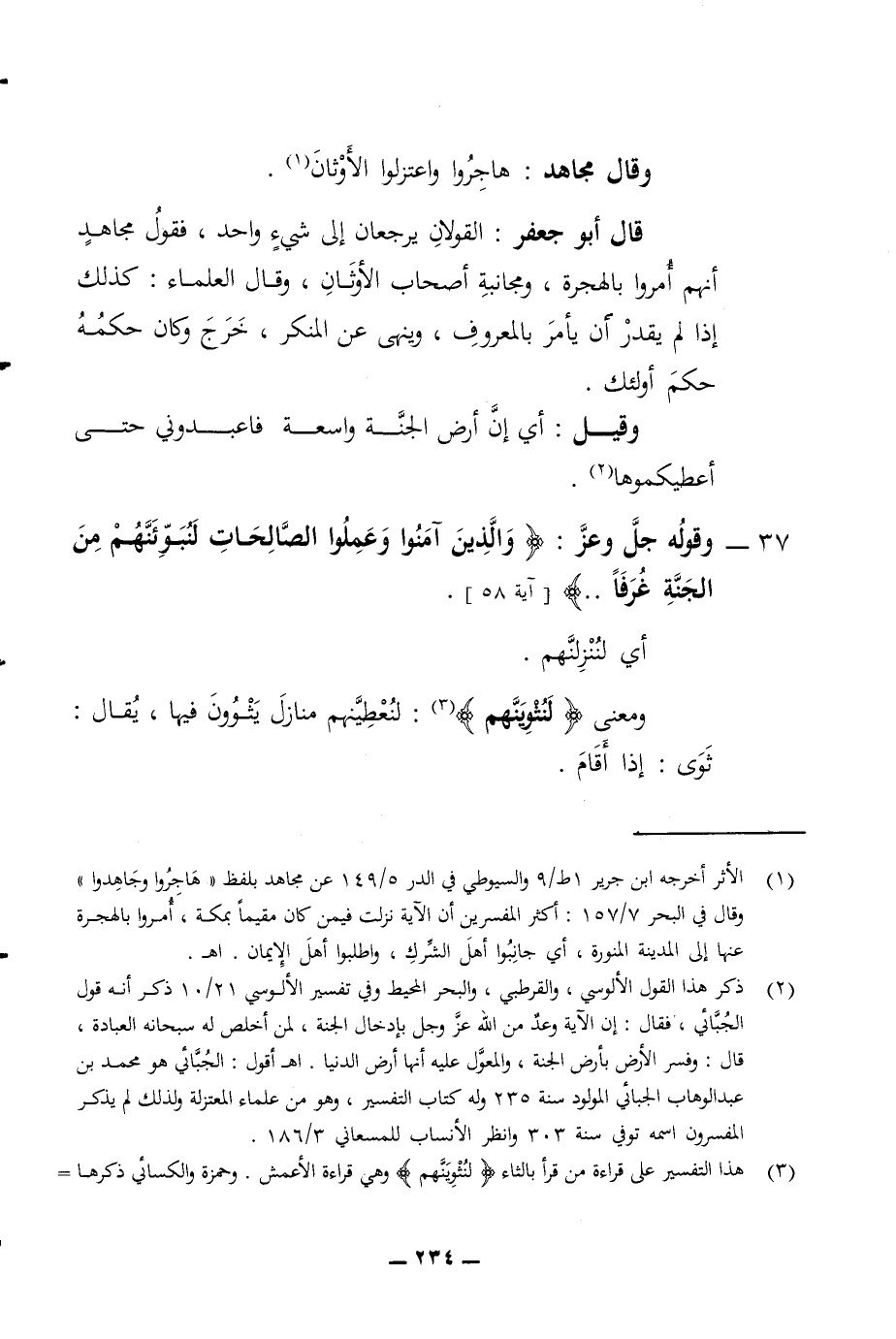 وقال مجاهد هاجروا واعتزلوا الأوثان قال أبو جعفر القولان يرجعان إلى شئ واحد فقول مجاهد أنهم أمروا بالهجرة ومجانبة أصحاب الأوثان وقال العلماء كذلك إذا لم يقدر أن يأمر بالمعروف وينهى عن المنكر خرج وكان حكمه حكم أولئك وقيل أي إن أرض الجنة واسعة فاعبدوني حتى أعطيكموها 37 - وقوله جل وعز والذين آمنوا وعملوا الصالحات لنبوئنهم من الجنة غرفا آية 58 أي لننزلنهم ومعنى لنثوينهم لنعطينهم منازل يثوون فيها يقال ثوى إذا أقام