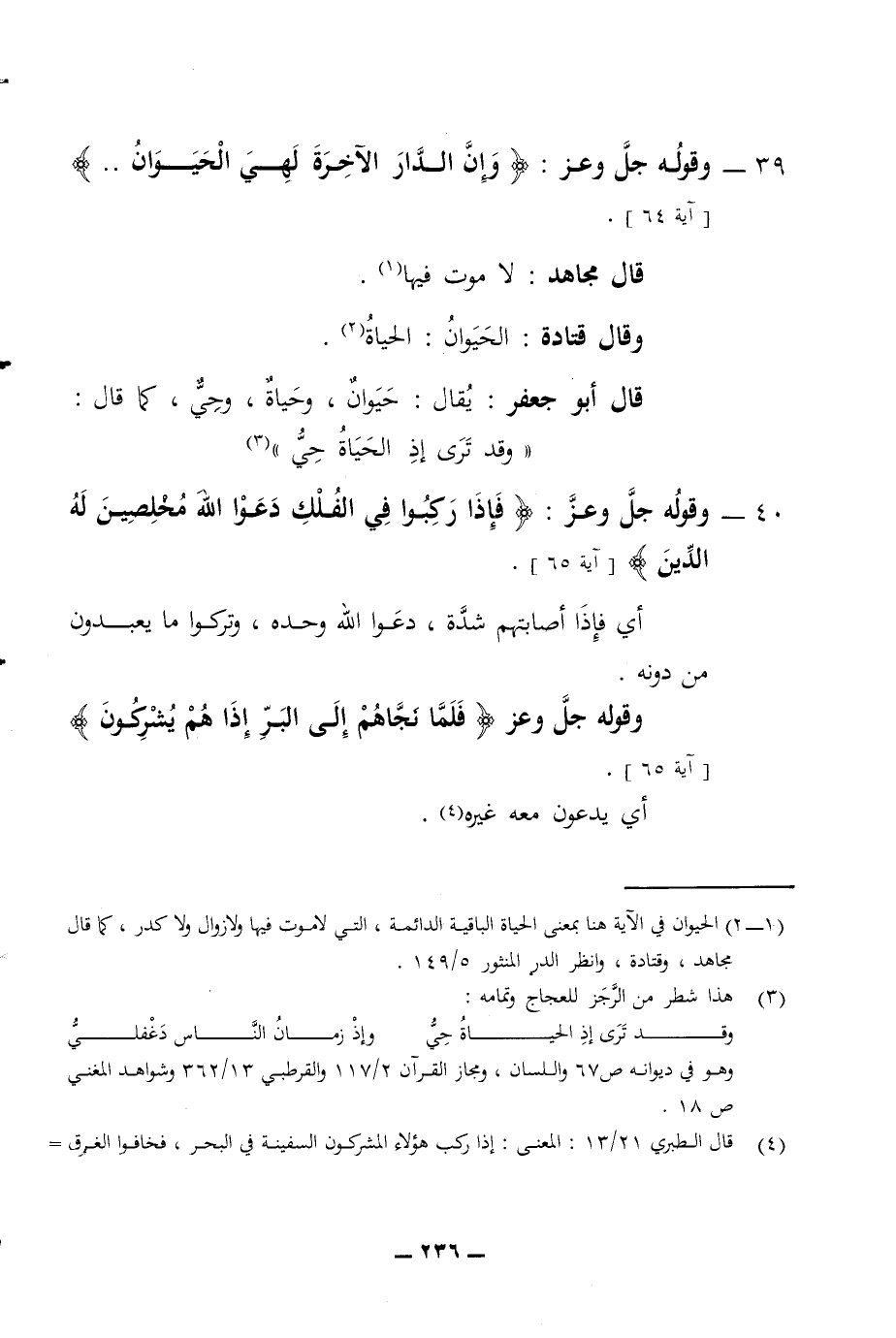 39 - وقوله جل وعز وإن الدار الآخرة لهي الحيوان آية 64 قال مجاهد لا موت فيها وقال قتادة الحيوان الحياة قال أبو جعفر يقال حيوان وحياة وحي كما قال * وقد ترى إذ الحياة حي 40 - وقوله جل وعز فإذا ركبوا في الفلك دعوا الله مخلصين له الدين آية 65 أي فإذا أصابتهم شدة دعوا الله وحده وتركوا ما يعبدون من دونه وقوله جل وعز فلما نجاهم إلى البر إذا هم يشركون أي يدعون معه غيره