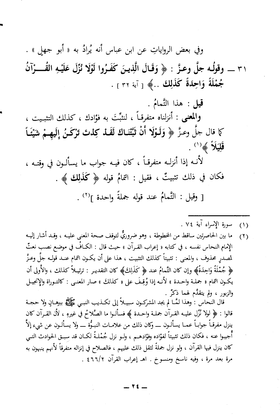 وفي بعض الروايات عن ابن عباس أنه يراد به أبو جهل 31 - وقوله جل وعز وقال الذين كفروا لولا نزل عليه القرآن جملة واحدة كذلك آية 32 قيل هذا التمام والمعنى أنزلناه متفرقا لنثبت به فؤادك كذلك التثبيت كما قال جل وعز ولولا أن ثبتناك لقد كدت تركن إليهم شيئا قليلا