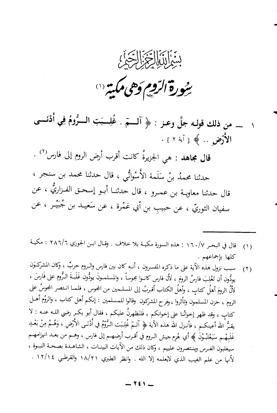 بسم الله الرحمن الرحيم سورة الروم وهي مكية 1 - من ذلك قوله جل وعز آلم غلبت الروم في أدنى الأرض آية 2 قال مجاهد هي الجزيرة كانت أقرب أرض الروم إلى فارس حدثنا محمد بن سلمة الأسواني قال حدثنا محمد بن سنجر قال حدثنا معاوية بن عمرو قال حدثنا أبو إسحق الفزاري عن سفيان الثوري عن حبيب بن أبي عمرة عن سعيد بن جبير عن