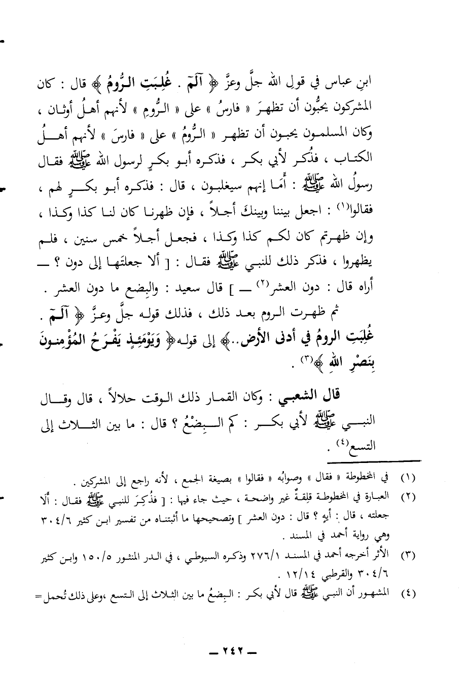 ابن عباس في قول الله جل وعز آلم غلبت الروم قال كان المشركون يحبون أن تظهر فارس على الروم لأنهم أهل أوثان وكان المسلمون يحبون أن تظهر الروم على فارس لأنهم أهل الكتاب فذكر لأبي بكر فذكره أبو بكر لرسول الله صلى الله عليه وسلم فقال رسول الله صلى الله عليه وسلم أما إنهم سيغلبون قال فذكره أبو بكر لهم فقالوا اجعل بيننا وبينك أجلا فإن ظهرنا كان لنا كذا وكذا وإن ظهرتم كان لكم كذا وكذا فجعل أجلا خمس سنين فلم يظهروا فذكر ذلك للنبي صلى الله عليه وسلم فقال الا جعلتها ما دون أراه قال دون العشر قال سعيد والبضع ما دون العشر ثم ظهرت الروم بعد ذلك فذلك قوله جل وعز آلم