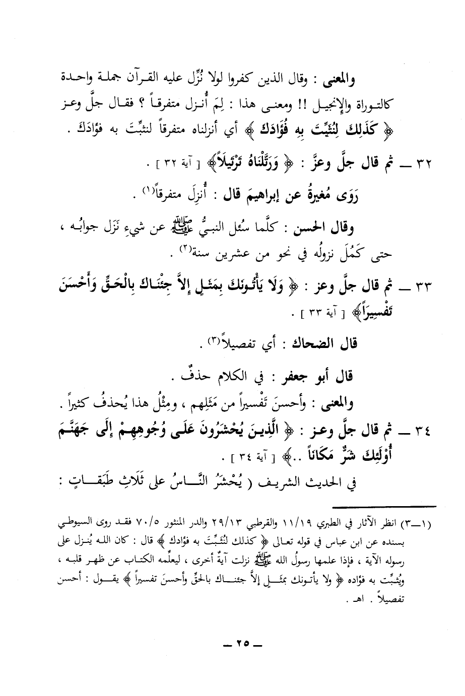 والمعنى وقال الذين كفروا لولا نزل عليه القرآن جملة واحدة كالتوراة والإنجيل ومعنى هذا لم أنزل متفرقا فقال جل وعز كذلك لنثبت به فؤادك أي أنزلناه متفرقا لنثبت به فؤادك 32 - ثم قال جل وعز ورتلناه ترتيلا آية 32 روى مغيرة عن إبراهيم قال أنزل متفرقا وقال الحسن كلما سئل النبي صلى الله عليه وسلم عن شئ نزل جوابه حتى كمل نزوله في نحو من عشرين سنة 33 - ثم قال جل وعز ولا يأتونك بمثل إلا جئناك بالحق وأحسن تفسيرا آية 33 قال الضحاك أي تفصيلا قال أبو جعفر في الكلام حذف والمعنى وأحسن تفسيرا من مثلهم ومثل هذا يحذف كثيرا 34 - ثم قال جل وعز الذين يحشرون على وجوههم إلى جهنم أولئك شر مكانا آية 34 في الحديث الشريف يحشر الناس على ثلاث طبقات