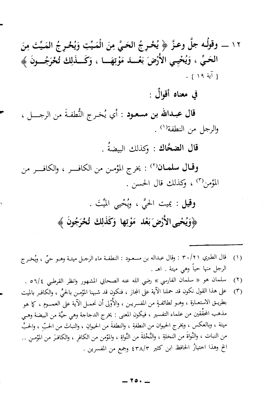 12 - وقوله جل وعز يخرج الحي من الميت ويخرج الميت من الحي ويحي الأرض بعد موتها وكذلك تخرجون آية 19 في معناه أقوال قال عبد الله بن مسعود أي يخرج النطفة من الرجل والرجل من النطفة