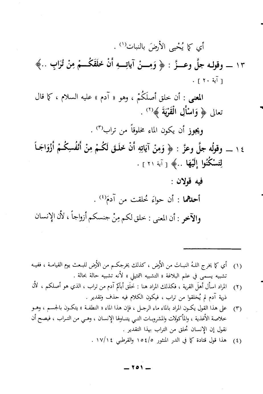أي كما يحيي الأرض بالنبات 13 - وقوله جل وعز ومن آياته أن خلقكم من تراب آية 20 المعنى أن خلق أصلكم وهو آدم عليه السلام كما قال تعالى واسأل القرية ويجوز أن يكون الماء مخلوقا من تراب 14 - وقوله جل وعز ومن آياته أن خلق لكم من أنفسكم أزواجا لتسكنوا إليها فيه قولان أحدهما أن حواء خلقت من آدم والآخر أن المعنى خلق لكم من جنسكم أزواجا لأن الإنسان