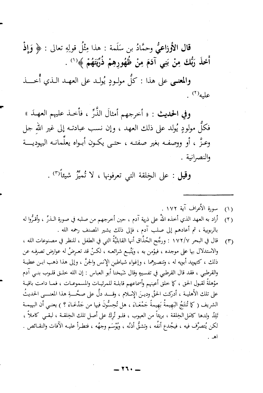 قال الأوزاعي وحماد بن سلمة هذا مثل قوله تعالى وإذ أخذ ربك من بني آدم من ظهورهم ذريتهم والمعنى على هذا كل مولود يولد على العهد الذي أخذ
