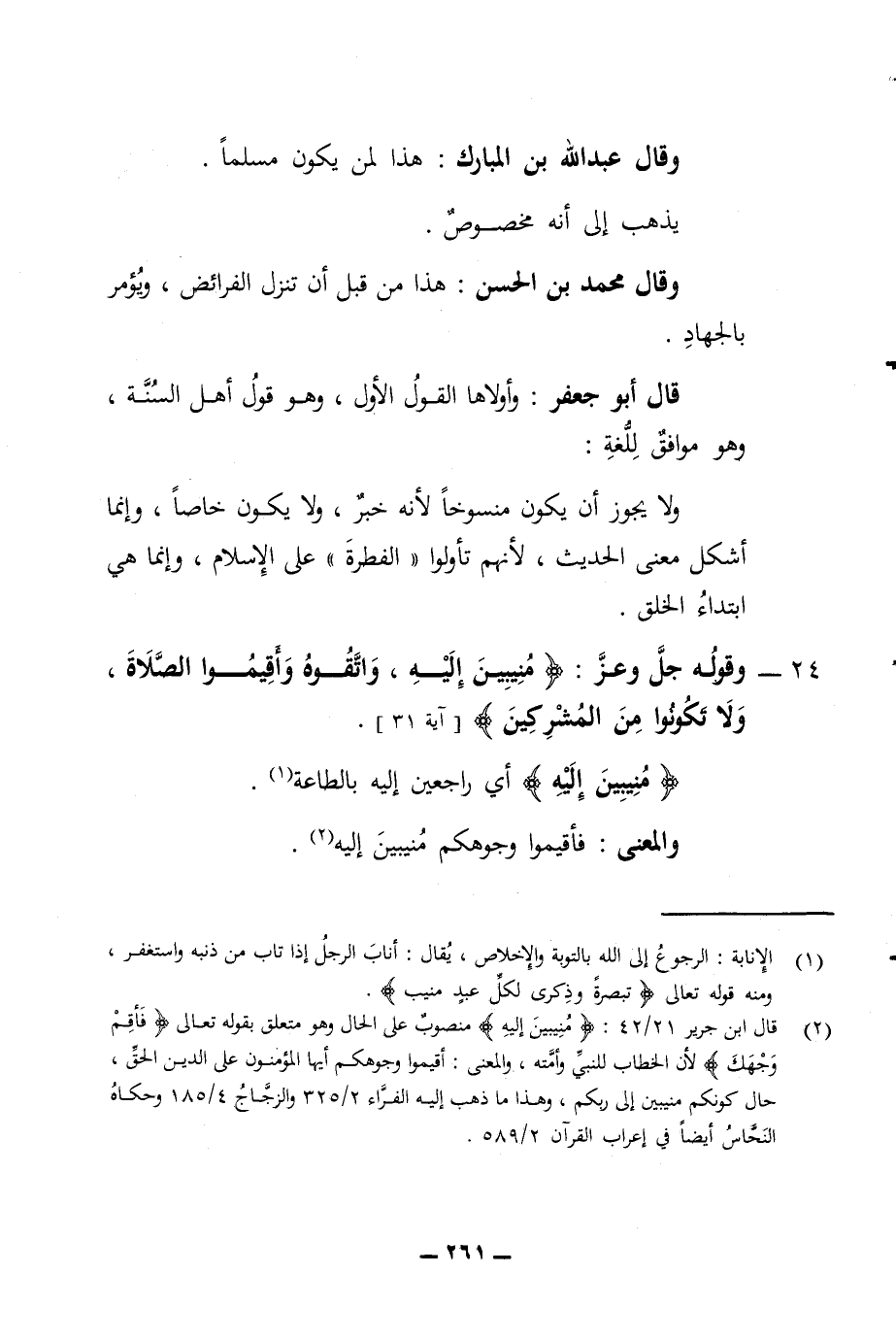 وقال عبد الله بن المبارك هذا لمن يكون مسلما يذهب إلى أنه مخصوص وقال محمد بن الحسن هذا من قبل أن تنزل الفرائض ويؤمر بالجهاد قال أبو جعفر وأولاها القول الأول وهو قول أهل السنة وهو موافق للغة ولا يجوز أن يكون منسوخا لأنه خبر ولا يكون خاصا وإنما أشكل معنى الحديث لأنهم تأولوا الفطرة على الإسلام وإنما هي ابتداء الخلق 24 - وقوله جل وعز منيبين إليه واتقوه وأقيموا الصلاة ولا تكونوا من المشركين منيبين إليه أي راجعين إليه بالطاعة والمعنى فأقيموا وجوهكم منيبين إليه