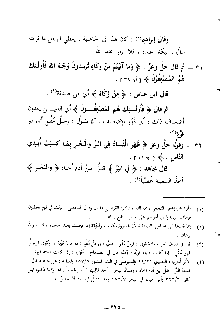 وقال ابراهيم كان هذا في الجاهلية يعطي الرجل ذا قرابته المال ليكثر عنده فلا يربو عند الله 31 - ثم قال جل وعز وما آتيتم من زكاة تريدون وجه الله فأولئك هم المضعفون آية 39 قال ابن عباس من زكاة أي من صدقة ثم قال فأولئك هم المضعفون أي الذين يجدون أضعاف ذلك أي ذوو الإضعاف كما تقول رجل مقو أي ذو قوة 32 - وقوله جل وعز ظهر الفساد في البر والبحر بما كسبت أيدي الناس آية 41 قال مجاهد في البر قتل ابن آدم أخاه والبحر أخذ السفينة غصبا