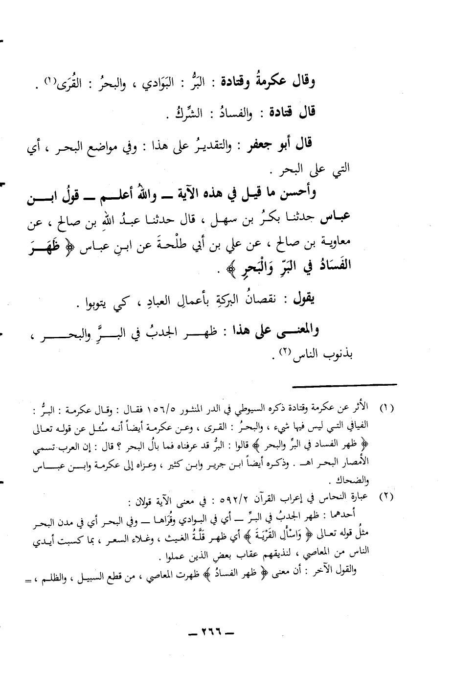 وقال عكرمة وقتادة البر البوادي والبحر القرى قال قتادة والفساد الشرك قال أبو جعفر والتقدير على هذا وفي مواضع البحر أي التي على البحر وأحسن ما قيل في هذه الآية والله أعلم قول ابن عباس حدثنا بكر بن سهل قال حدثنا عبد الله بن صالح عن معاوية بن صالح عن علي بن أبي طلحة عن ابن عباس ظهر الفساد في البر والبحر يقول نقصان البركة بأعمال العباد كي يتوبوا والمعنى على هذا ظهر الجدب في البر والبحر بذنوب الناس