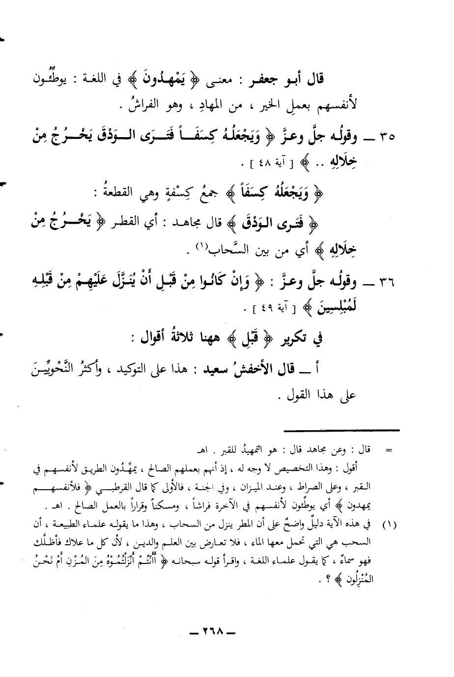 قال أبو جعفر معنى يمهدون في اللغة يوطئون لأنفسهم بعمل الخير من المهاد وهو الفراش 35 - وقوله جل وعز ويجعله كسفا فترى الودق يخرج من خلاله آية 48 ويجعله كسفا جمع كسفة وهي القطعة فترى الودق قال مجاهد أي القطر يخرج يخرج من خلاله أي من بين السحاب 37 - وقوله جل وعز وإن كانوا من قبل أن ينزل عليهم من قبله لمبلسين آية 49 في تكرير قبل ههنا ثلاثة أقوال أ - قال الأخفش سعيد هذا على التوكيد وأكثر النحويين على هذا القول