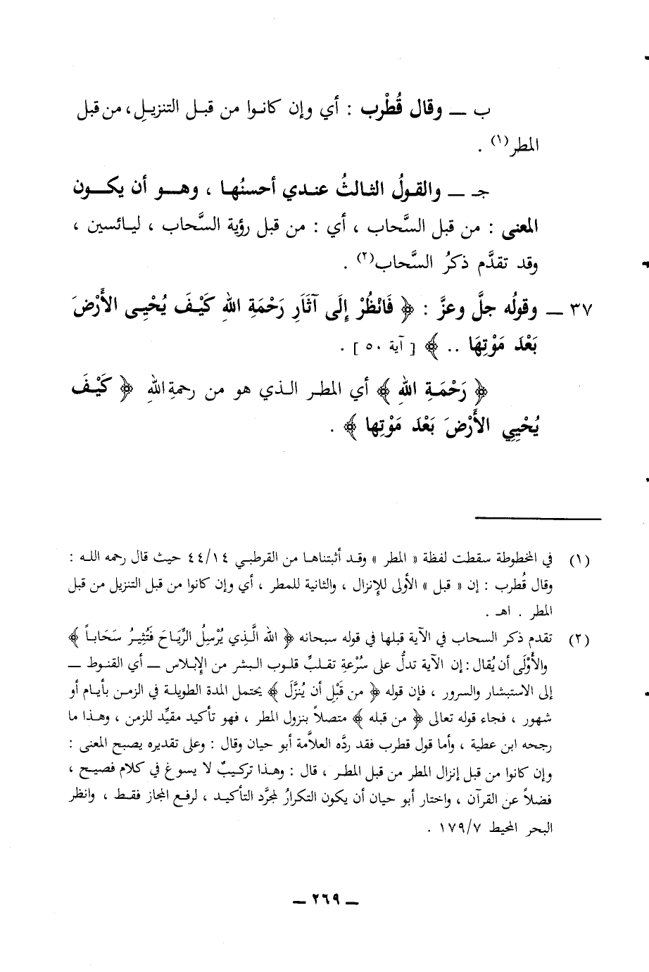 ب - وقال قطرب أي وإن كانوا من قبل التنزيل من قبل المطر ج والقول الثالث عندي أحسنها وهو أن يكون المعنى من قبل السحاب أي من قبل رؤية السحاب ليائسين وقد تقدم ذكر السحاب 37 - وقوله جل وعز فانظر إلى آثار رحمة الله كيف يحيى الأرض بعد موتها آية 50