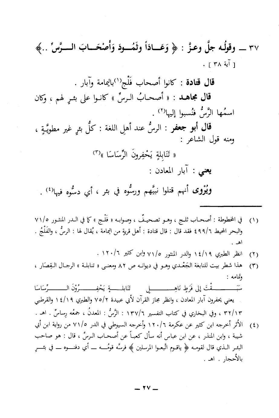 37 - وقوله جل وعز وعادا وثمود وأصحاب الرس آية 38 قال قتادة كانوا أصحاب فلج باليمامة وآبار قال مجاهد أصحاب الرس كانوا على بئر لهم وكان اسمها الرس فنسبوا إليها قال أبو جعفر الرس عند أهل اللغة كل بئر غير مطوية ومنه قول الشاعر * تنابلة يحفرون الرساسا يعني آبار المعادن ويروى أنهم قتلوا نبيهم ورسوه في بئر أي دسوه فيها