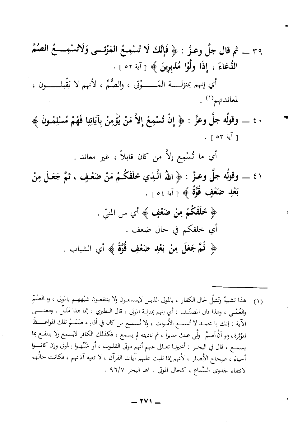 39 - ثم قال جل وعز فإنك لا تسمع الموتى ولا تسمع الصم الدعاء إذا ولوا مدبرين آية 52 أي إنهم بمنزلة الموتى والصم لأنهم لا يقبلون لمعاندتهم 40 - وقوله جل وعز إن تسمع إلا من يؤمن بآياتنا فهم مسلمون آية 53 أي ما تسمع إلا من كان قابلا غير معاند