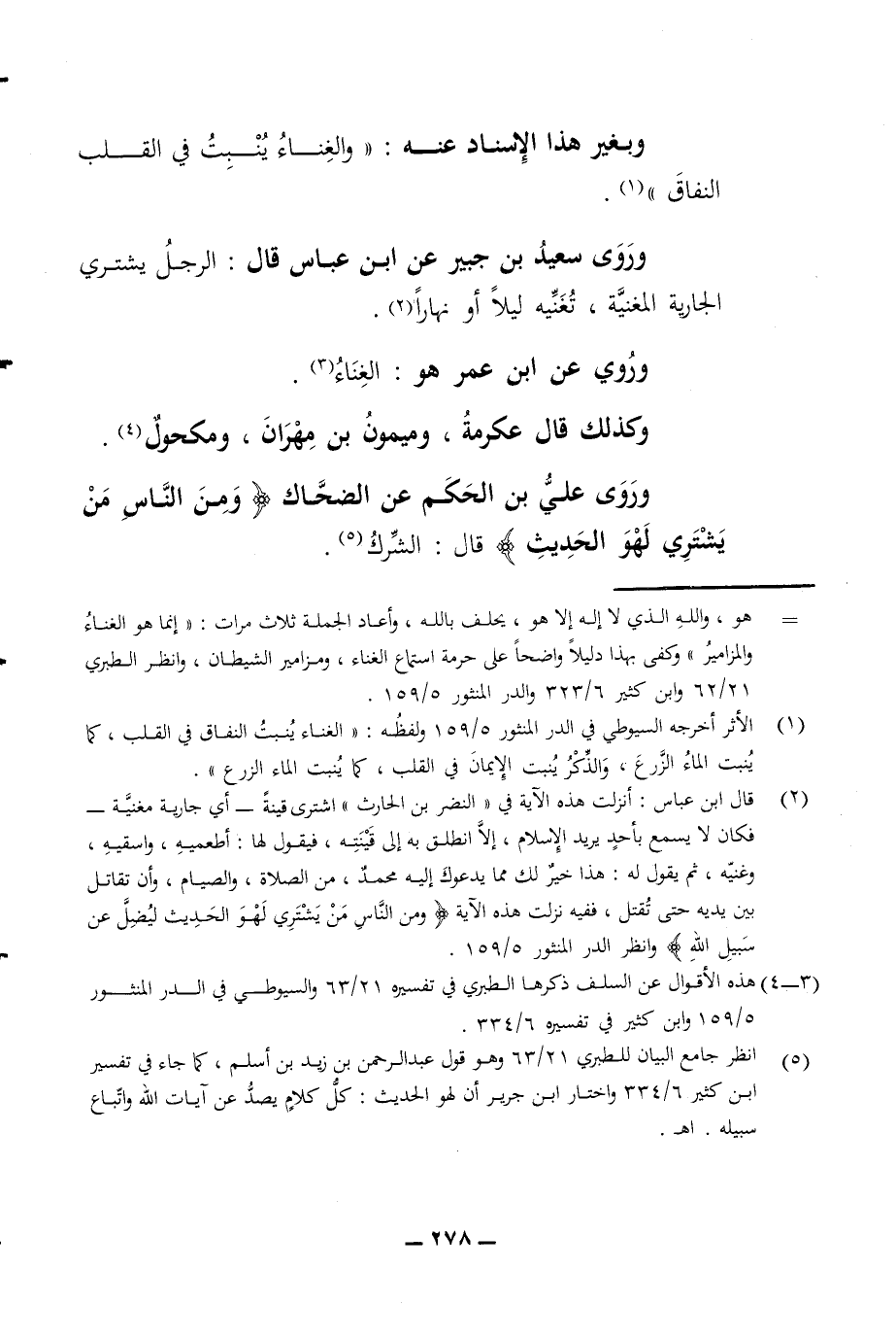 وبغير هذا الإسناد عنه والغناء ينبت في القلب النفاق وروى سعيد بن جبير عن ابن عباس قال الرجل يشتري الجارية المغنية تغنيه ليلا أو نهارا وروي عن ابن عمر هو الغناء وكذلك قال عكرمة وميمون بن مهران ومكحول وروى علي بن الحكم عن الضحاك ومن الناس من يشتري لهو الحديث قال الشرك