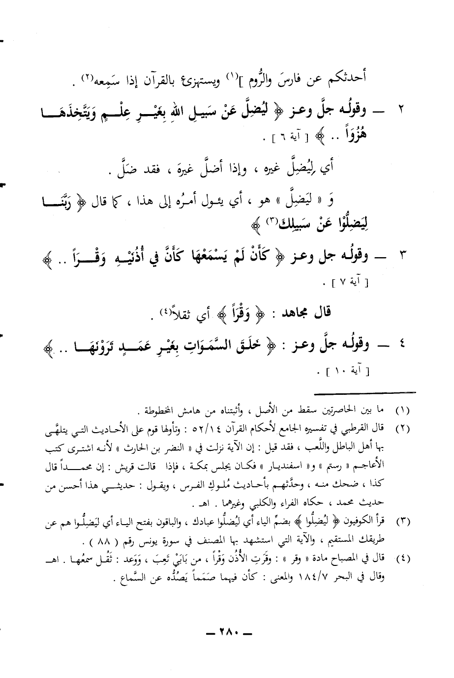 2 - وقوله جل وعز ليضل عن سبيل الله بغير علم ويتخذها هزوا آية 6 أي ليضل غيره وإذا أضل غيره فقد ضل وليضل هو أي يئول أمره إلى هذا كما قال ربنا ليضلوا عن سبيلك 3 - وقوله جل وعز كأن لم يسمعها كأن في أذنيه وقرا آية 7 قال مجاهد وقرا أي ثقلا 4 - وقوله جل وعز خلق السموات بغير عمد ترونها