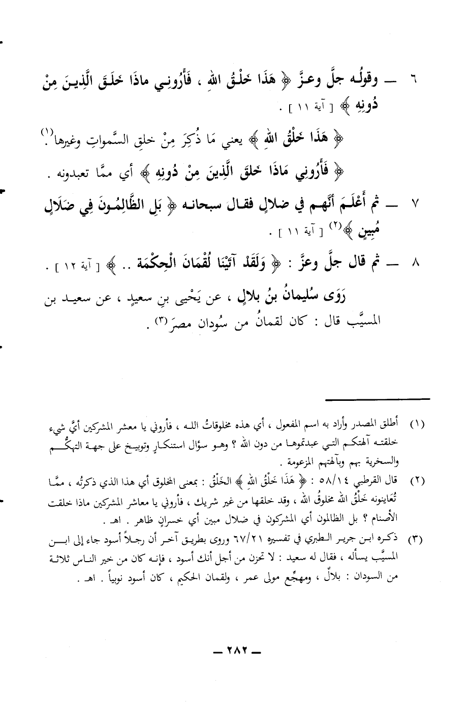 6 - وقوله جل وعز هذا خلق الله فأروني ماذا خلق الذين من دونه آية 11 هذا خلق الله يعني ما ذكر من خلق السموات وغيرها فأروني ماذا خلق الذين من دونه أي مما تعبدونه 7 - ثم أعلم أنهم في ضلال فقال سبحانه بل الظالمون في ضلال مبين آية 11 8 - ثم قال جل وعز ولقد آتينا لقمان الحكمة آية 12 روى سليمان بن بلال عن يحيى بن سعيد عن سعيد بن المسيب قال كان لقمان من سودان مصر