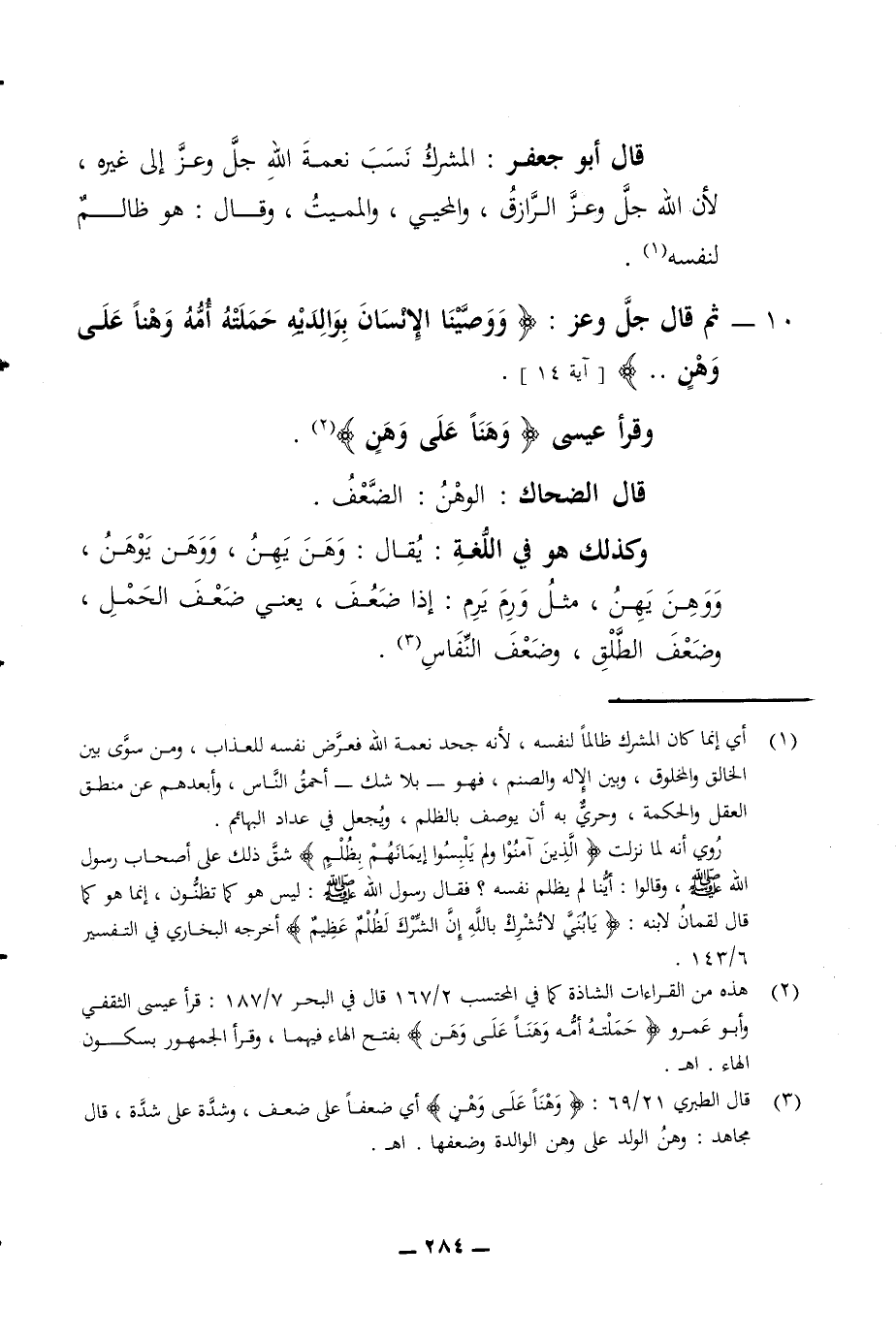 لأن الله جل وعز الرزاق والمحيي والمميت وقال هو ظالم لنفسه 10 - ثم قال جل وعز ووصينا الإنسان بوالديه حملته أمه وهنا على وهن آية 14 وقرأ عيسى وهنا على وهن قال الضحاك الوهن الضعف وكذلك هو في اللغة يقال وهن يهن ووهن يوهن ووهن يهن مثل ورم يرم إذا ضعف يعني ضعف الحمل وضعف الطلق وضعف النفاس