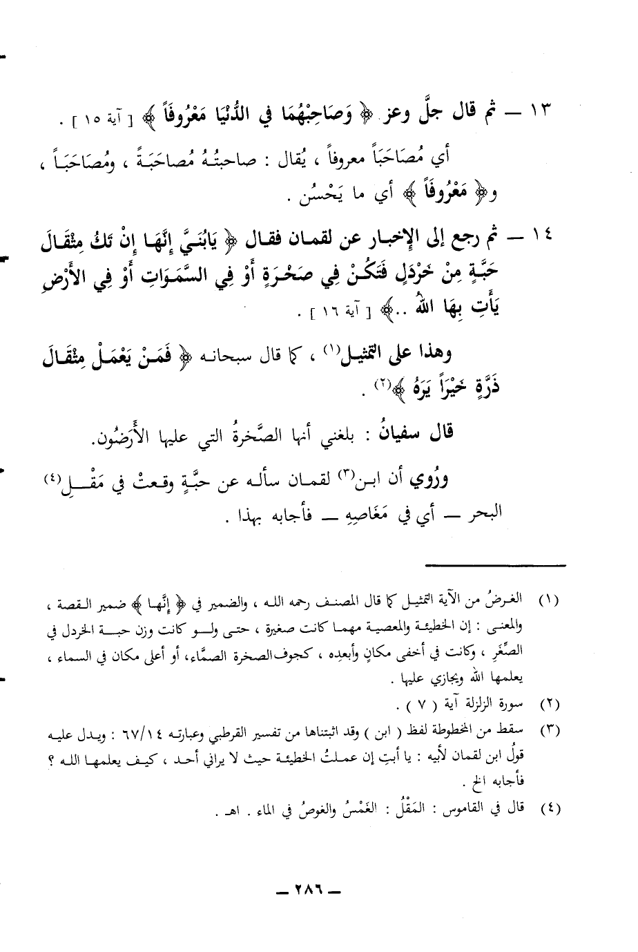 13 - ثم قال جل وعز وصاحبهما في الدنيا معروفا آية 15 أي مصاحبا معروفا يقال صاحبته مصاحبة ومصاحبا ومعروفا أي ما يحسن
