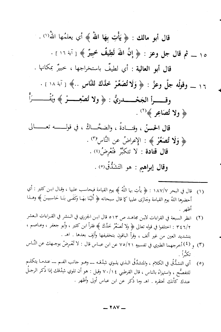 قال أبو مالك يأت بها الله أي يعلمها الله 15 - ثم قال جل وعز إن الله لطيف خبير آية 16 قال أبو العالية أي لطيف باستخراجها خبير بمكانها 16 - وقوله جل وعز ولا تصعر خدك للناس آية 18 وقرأ الجحدري ولا تصعر ويقرأ ولا تصاعر قال الحسن وقتادة والضحاك في قوله تعالى ولا تصعر الإعراض عن الناس قال قتادة لا تتكبر فتعرض وقال إبراهيم هو التشدق