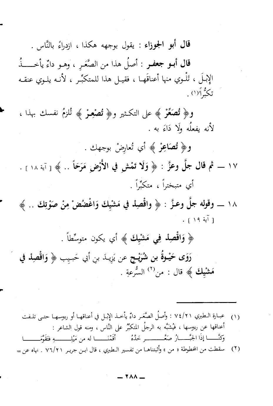 الإبل تلوي منها أعناقها فقيل هذا للمتكبر لأنه يلوي عنقه تكبرا وتصعر على التكثير وتصعر تلزم نفسك بهذا لأنه يفعله ولا داء به وتصاعر أي تعارض بوجهك 17 - ثم قال جل وعز ولا تمش في الأرض مرحا آية 18 أي متبخترا متكبرا 18 - وقوله جل وعز واقصد في مشيك واغضض من صوتك آية 19 واقصد في مشيك أي يكون متوسطا روى حيوة بن شريح عن يزيد بن أبي حبيب واقصد في مشيك قال من السرعة