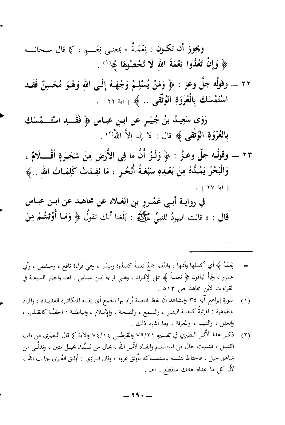 ويجوز أن تكون نعمة بمعنى نعم كما قال سبحانه وإن تعدوا نعمة الله لا تحصوها 22 - وقوله جل وعز ومن سلم وجهه إلى الله وهو محسن فقد استمسك بالعروة الوثقى آية 22 روى سعيد بن جبير عن ابن عباس فقد استمسك بالعروة الوثقى قال لا إله إلا الله 23 - وقوله جل وعز ولو أن ما في الأرض من شجرة أقلام والبحر يمده من بعده سبعة أبحر ما نفدت كلمات الله آية 27 في رواية أبي عمرو بن العلاء عن مجاهد عن ابن عباس قال قالت اليهود للنبي صلى الله عليه وسلم بلغنا أنك تقول وما أوتيتم من