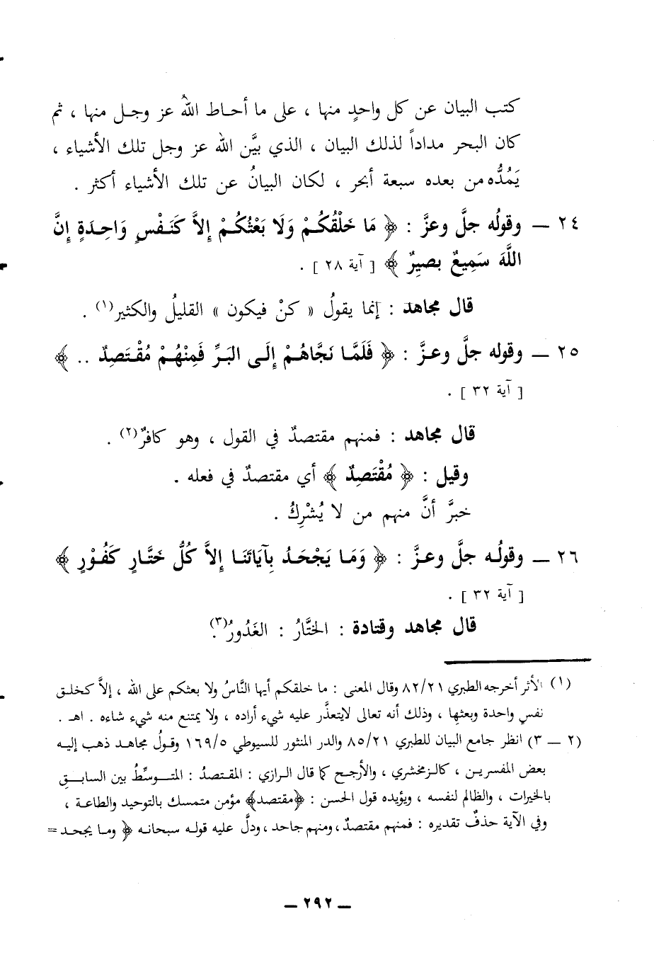 كتب البيان عن كل واحد منها على ما أحاط الله عز وجل منها ثم كان البحر مدادا لذلك البيان الذي بين الله عز وجل تلك الأشياء يمده من بعده سبعة أبحر لكان البيان عن تلك الأشياء أكثر 24 - وقوله جل وعز ما خلقكم ولا بعثكم إلا كنفس واحدة إن الله سميع بصير قال مجاهد إنما يقول كن فيكون القليل والكثير 25 - وقوله جل وعز فلما نجاهم إلى البر فمنهم مقتصد آية 32 قال مجاهد فمنهم مقتصد في القول وهو كافر وقيل مقتصد أي مقتصد في فعله خبر أن منهم من لا يشرك 26 - وقوله جل وعز وما يجحد بآياتنا إلا كل ختار كفور
