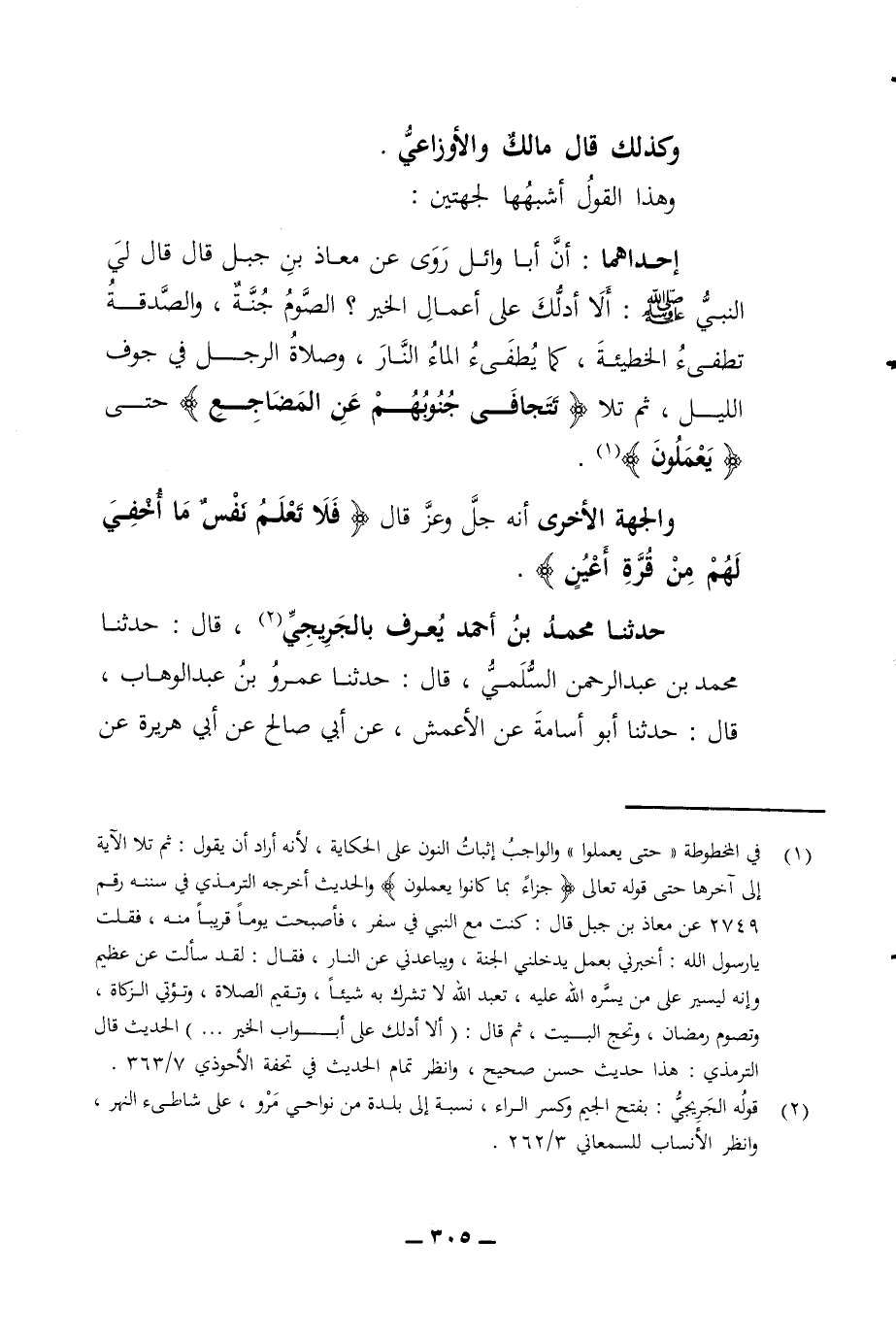 وهذا القول أشبهها لجهتين إحداهما أن أبا وائل روى عن معاذ بن جبل قال قال لي النبي صلى الله عليه وسلم ألا أدلك على أعمال الخير الصوم جنة والصدقة تطفئ الخطيئة كما يطفئ الماء النار وصلاة الرجل في جوف الليل ثم تلا تتجافى جنوبهم عن المضاجع حتى يعملون والجهة الأخرى أنه جل وعز قال فلا تعلم نفس ما أخفي لهم من قرة أعين حدثنا محمد بن أحمد يعرف بالجريجي قال حدثنا محمد بن عبد الرحمن السلمي قال حدثنا عمرو بن عبد الوهاب قال حدثنا أبو أسامة عن الأعمش عن أبي صالح عن أبي هريرة عن