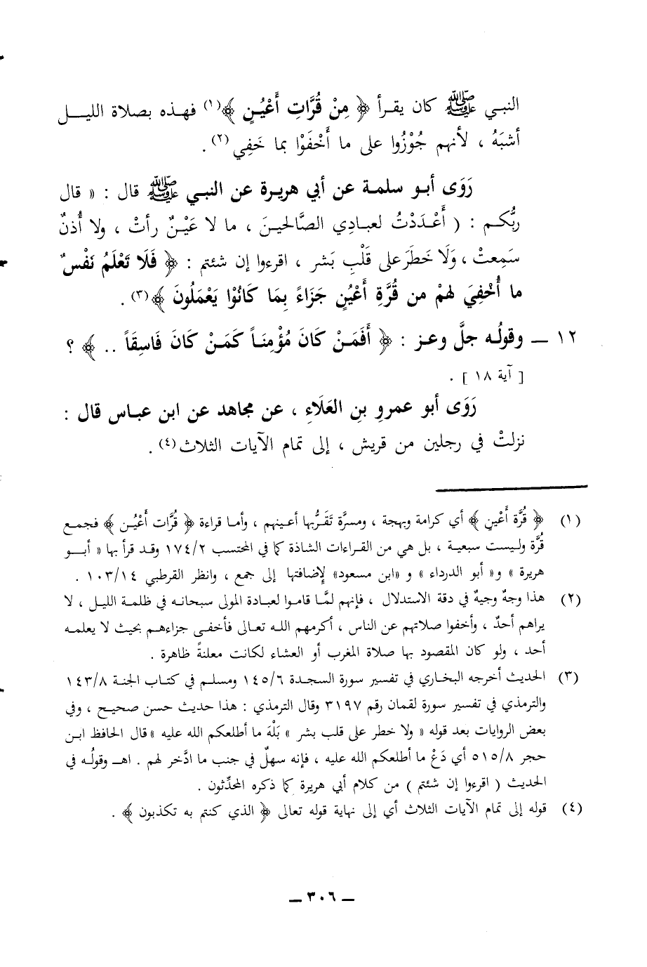 النبي صلى الله عليه وسلم كان يقرأ من قرات أعين فهذه بصلاة الليل أشبه لأنهم جوزوا على ما أخفوا بما خفي روى أبو سلمة عن أبي هريرة عن النبي صلى الله عليه وسلم قال قال ربكم أعددت لعبادي الصالحين ما لا عين رأت ولا أذن سمعت ولا خطر على قلب بشر اقرءوا إن شئتم فلا تعلم نفس ما أخفي لهم من قرة أعين جزاء بما كانوا يعملون 306 - وقوله جل وعز أفمن كان مؤمنا كمن كان فاسقا آية 18 روى أبو عمرو بن العلاء عن مجاهد عن ابن عباس قال نزلت في رجلين من قريش إلى تمام الآيات الثلاث