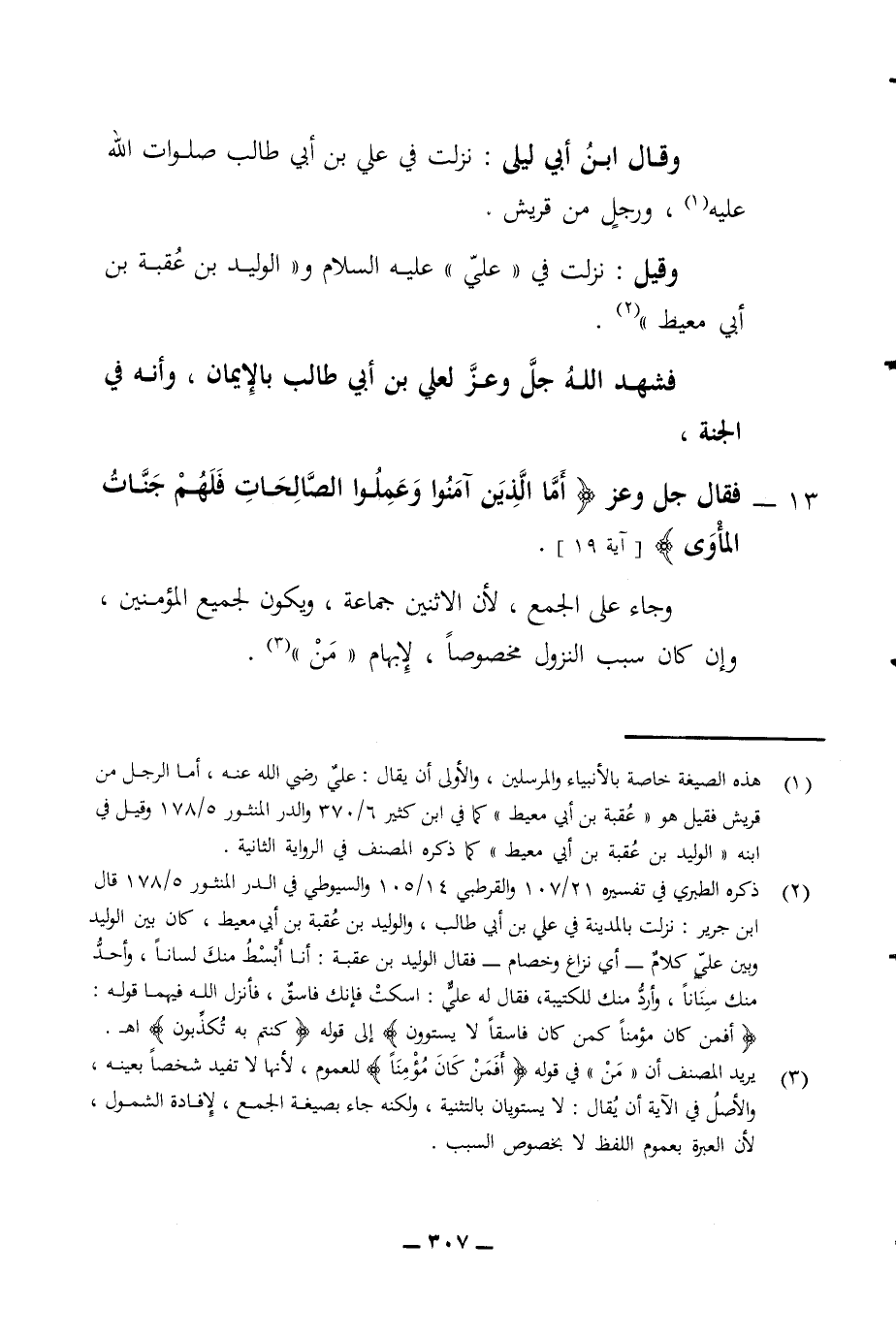 وقال ابن أبي ليلى نزلت في علي بن أبي طالب صلوات الله عليه ورجل من قريش وقيل نزلت في علي عليه السلام والوليد بن عقبة بن أبي معيط فشهد الله جل وعز لعلي بن أبي طالب بالإيمان وأنه في الجنة 13 - فقال جل وعز أما الذين آمنوا وعملوا الصالحات فلهم جنات المأوى آية 19 وجاء على الجمع لأن الاثنين جماعة ويكون لجميع المؤمنين وإن كان سبب النزول مخصوصا لإبهام من