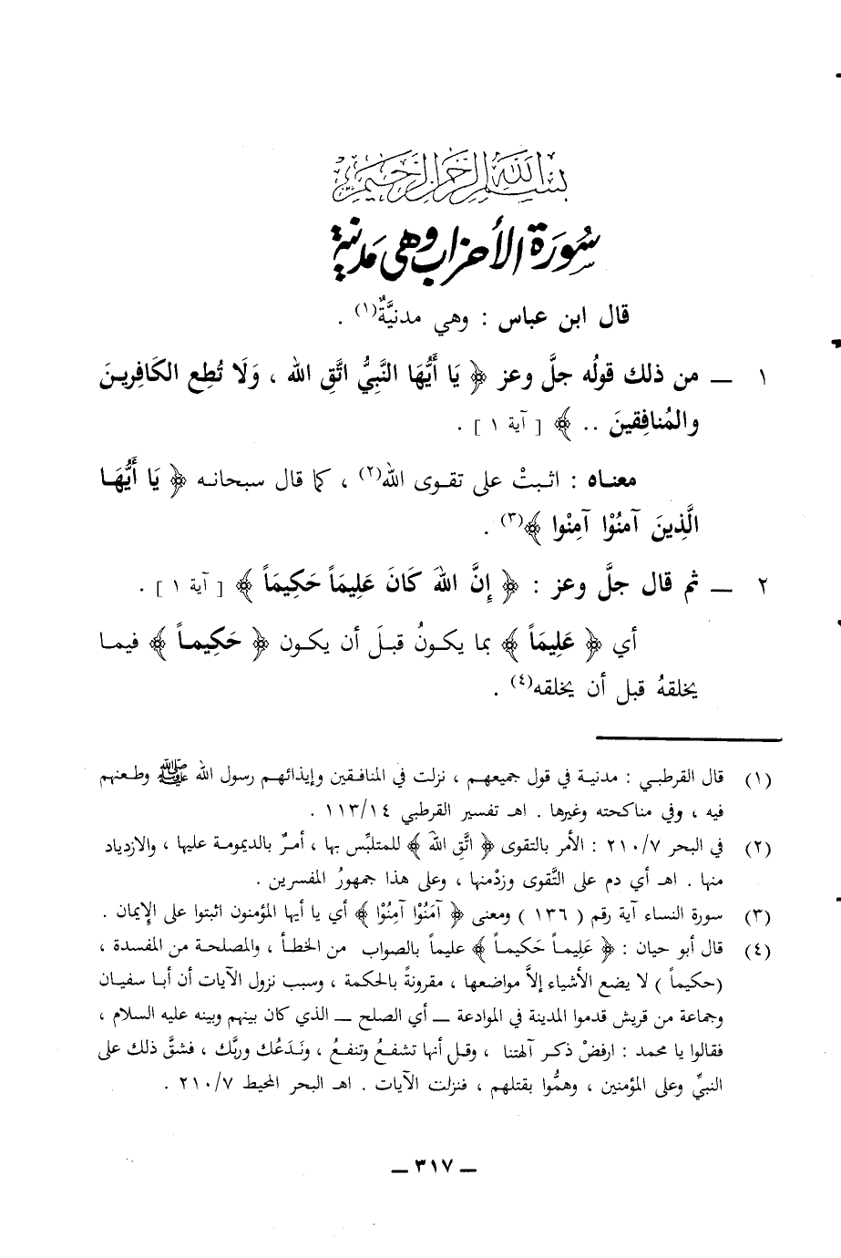 سورة الأحزاب وهى مدنية قال ابن عباس وهي مدنية 1 - من ذلك قوله جل وعز يا أيها النبي اتق الله ولا تطع الكافرين والمنافقين آية 1 معناه اثبت على تقوى الله كما قال سبحانه يا أيها الذين آمنوا آمنوا 2 - ثم قال جل وعز إن الله كان عليما حكيما آية 1 أي عليما بما يكون قبل أن يكون حكيما فيما يخلقه قبل أن يخلقه