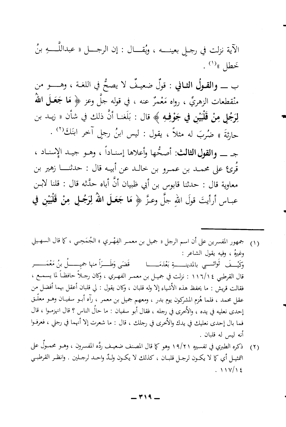 الآية نزلت في رجل بعينه ويقال إن الرجل عبد الله بن خطل والقول الثاني قول ضعيف لا يصح في اللغة وهو من منقطعات الزهري رواه معمر عنه في قوله جل وعز ما جعل الله لرجل من قلبين في جوفه قال بلغنا أن ذلك في شأن زيد بن حارثة ضرب له مثلا يقول ليس ابن رجل آخر ابنك والقول الثالث أصحها وأعلاها إسنادا وهو جيد الإسناد قرئ على محمد بن عمرو بن خالد عن أبيه قال حدثنا زهير بن معاوية قال حدثنا قابوس بن أبي ظبيان أن أباه حدثه قال قلنا لابن عباس أرأيت قول الله جل وعز ما جعل الله لرجل من قلبين في