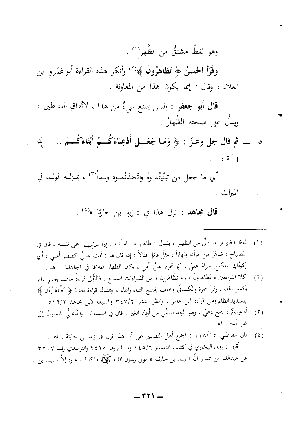 وهو لفظ مشتق من الظهر وقرأ الحسن تظاهرون وأنكر هذه القراءة أبو عمرو بن العلاء وقال إنما يكون هذا من المعاونة قال أبو جعفر وليس يمتنع شئ من هذا لاتفاق اللفظين ويدل على صحته الظهار 5 - ثم قال جل وعز وما جعل أدعياءكم أبناءكم آية 4 أي ما جعل من تبنيتموه واتخذتموه ولدا بمنزلة الولد في الميراث قال مجاهد نزل هذا في زيد بن حارثة