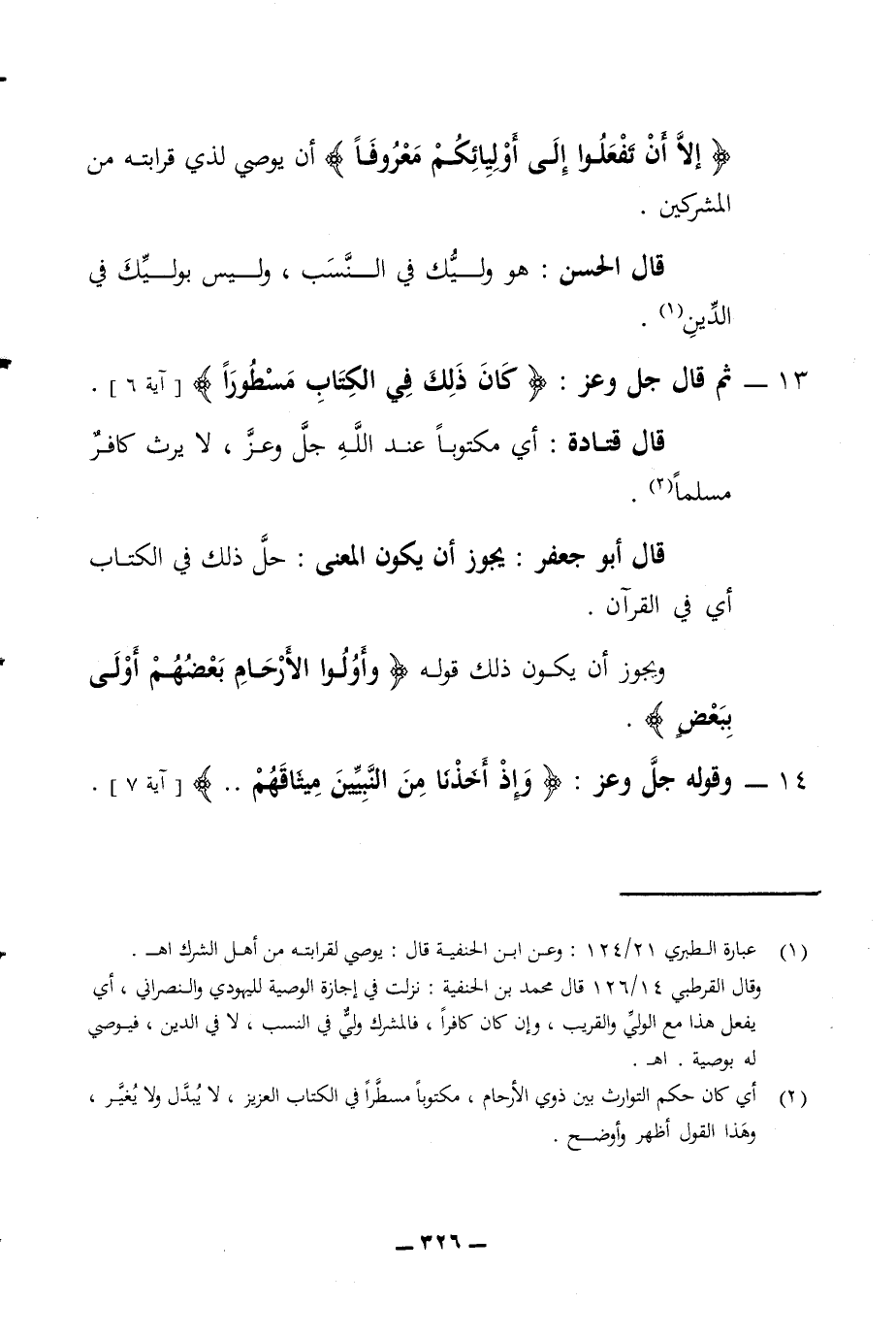 إلا أن تمعلوا الذي إلى أوليائكم معروفا أن يوصي لذي قرابته من المشركين قال الحسن هو وليك في النسب وليس بوليك في الدين 13 - ثم قال جل وعز كان ذلك في الكتاب مسطورا قال قتادة أي مكتوبا عند الله جل وعز لا يرث كافر مسلما قال أبو جعفر يجوز أن يكون المعنى حل ذلك في الكتاب أي في القرآن ويجوز أن يكون ذلك قوله وأولوا الأرحام بعضهم أولى ببعض 14 - وقوله جل وعز وإذ أخذنا من النبيين ميثاقهم