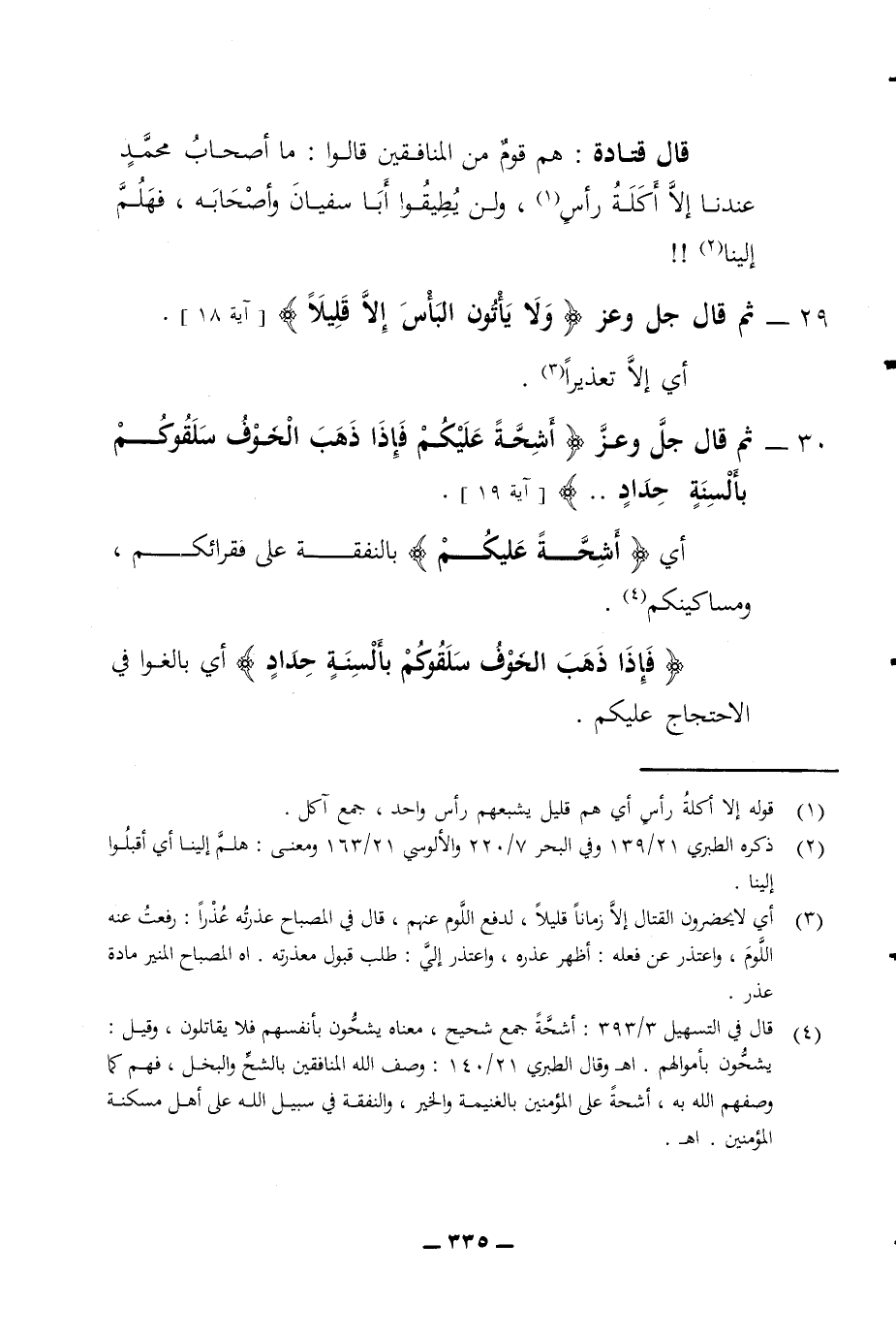 أي إلا تعذيرا 30 - ثم قال جل وعز أشحة عليكم فإذا ذهب الخوف سلقوكم بألسنة حداد آية 19 أي أشحة عليكم بالنفقة على فقرائكم ومساكينكم فإذا ذهب الخوف سلقوكم بألسنة حداد أي بالغوا في الاحتجاج عليكم