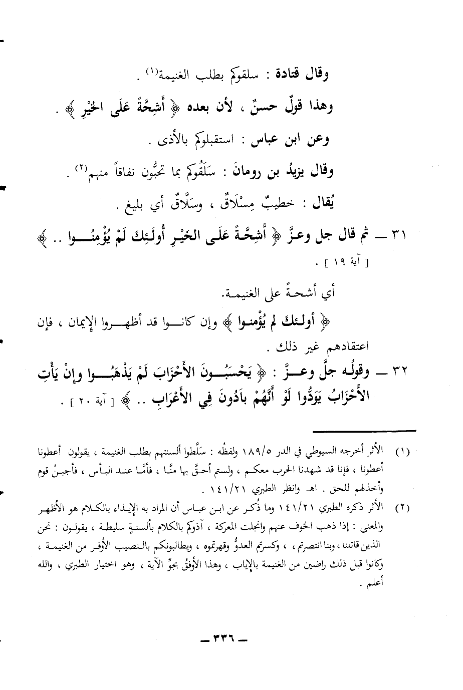 وقال قتادة سلقوكم بطلب الغنيمة وهذا قول حسن لأن بعده أشحة على الخير وعن ابن عباس استقبلوكم بالأذى وقال يزيد بن رومان سلقوكم بما تحبون نفاقا منهم يقال خطيب مسلاق وسلاق أي بليغ 31 - ثم قال جل وعز أشحة على الخير أولئك لم يؤمنوا آية 19 أي أشحة على الغنيمة أولئك لم يؤمنوا وإن كانوا قد أظهروا الإيمان فإن اعتقادهم غير ذلك 32 - وقوله جل وعز يحسبون الأحزاب لم يذهبوا وإن يأت الأحزاب يودوا لو أنهم بادون في الأعراب آية 20