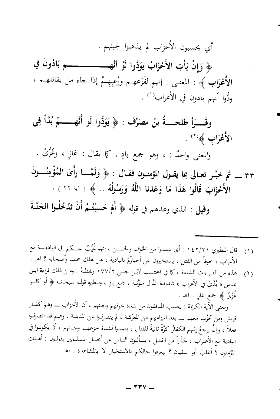 وإن يأت الأحزاب يودوا لو أنهم بادون في الأعراب المعنى إنهم لفزعهم ورعبهم إذا جاء من يقاتلهم ودوا أنهم بادون في الأعراب وقرأ طلحة بن مصرف يودوا لو أنهم بذا في الأعراب بدا والمعنى واحد وهو جمع باد كما يقال غزا وغزى 33 - ثم خبر تعالى بما يقول المؤمنون فقال ولما رأى المؤمنون الأحزاب قالوا هذا ما وعدنا الله ورسوله وقيل الذي وعدهم في قوله أم حسبتم أن تدخلوا الجنة