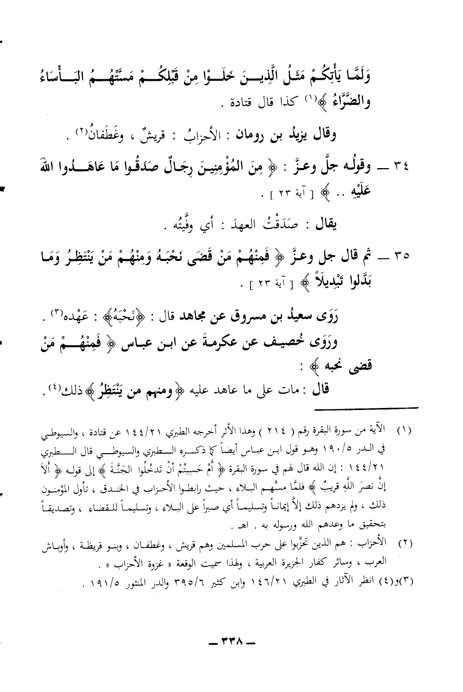 ولما يأتكم مثل الذين خلوا من قبلكم مستهم البأساء والضراء كذا قال قتادة وقال يزيد بن رومان الأحزاب قريش وغطفان 34 - وقوله جل وعز من المؤمنين رجال صدقوا ما عاهدوا الله عليه يقال صدقت العهد أي وفيته 35 - ثم قال جل وعز فمنهم من قضى نحبه ومنهم من ينتظر وما بدلوا تبديلا آية 23 روى سعيد بن مسروق عن مجاهد قال نحبه عهده وروى خصيف عن عكرمة عن ابن عباس فمنهم من قضى نحبه قال مات على ما عاهد عليه ومنهم من ينتظر ذلك