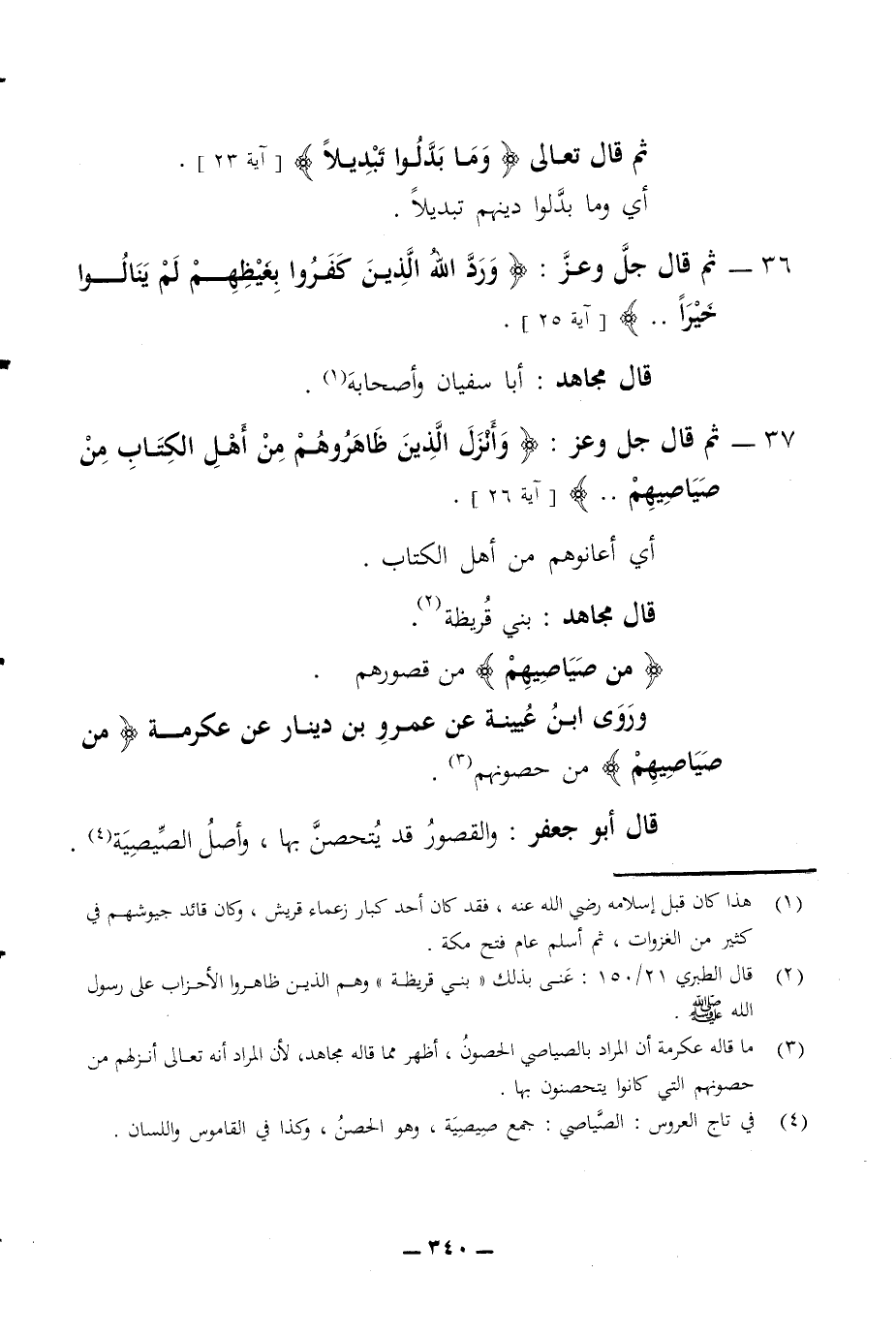 ثم قال تعالى وما بدلوا تبديلا أي وما بدلوا دينهم تبديلا 36 - ثم قال جل وعز ورد الله الذين كفروا بغيظهم لم ينالوا خيرا قال مجاهد أبا سفيان وأصحابه 37 - ثم قال جل وعز وأنزل الذين ظاهروهم من أهل الكتاب من صياصيهم أي أعاونهم من أهل الكتاب قال مجاهد بني قريظة من صياصهم من قصورهم وروى ابن عيينة عن عمرو بن دينار عن عكرمة من صياصيهم من حصونهم