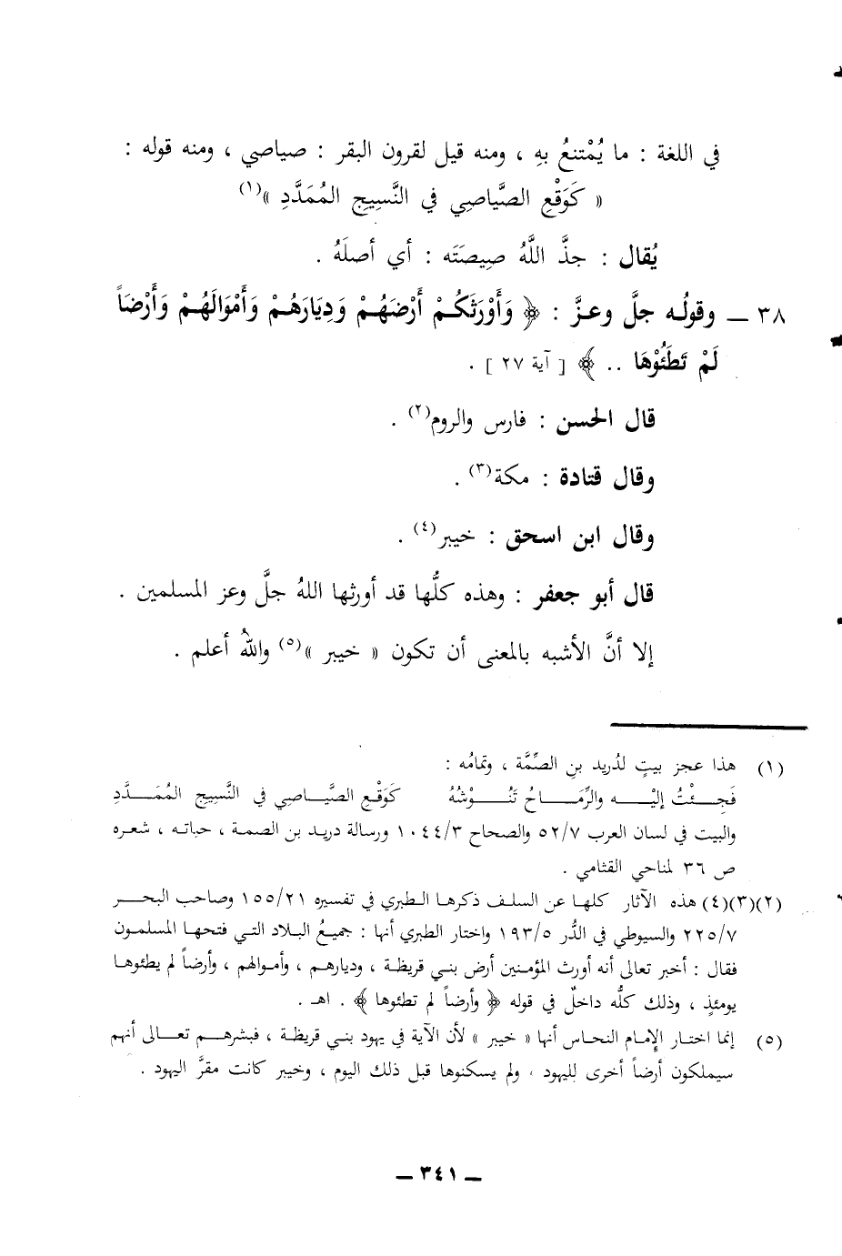 في اللغة ما يمتنع به ومنه قيل لقرون البقر صياصي ومنه قوله كوقع الصياصي في النسيج الممد * يقال جذ الله صيصته علي أي أصله 38 - وقوله جل وعز وأورثكم أرضهم وديارهم وأموالهم وأرضا لم تطئوها آية 27 قال الحسن فارس والروم وقال قتادة مكة وقال ابن اسحق خيبر وقال أبو جعفر وهذه كلها قد أورثها الله جل وعز المسلمين إلا أن الأشبه بالمعنى أن تكون خيبر والله أعلم