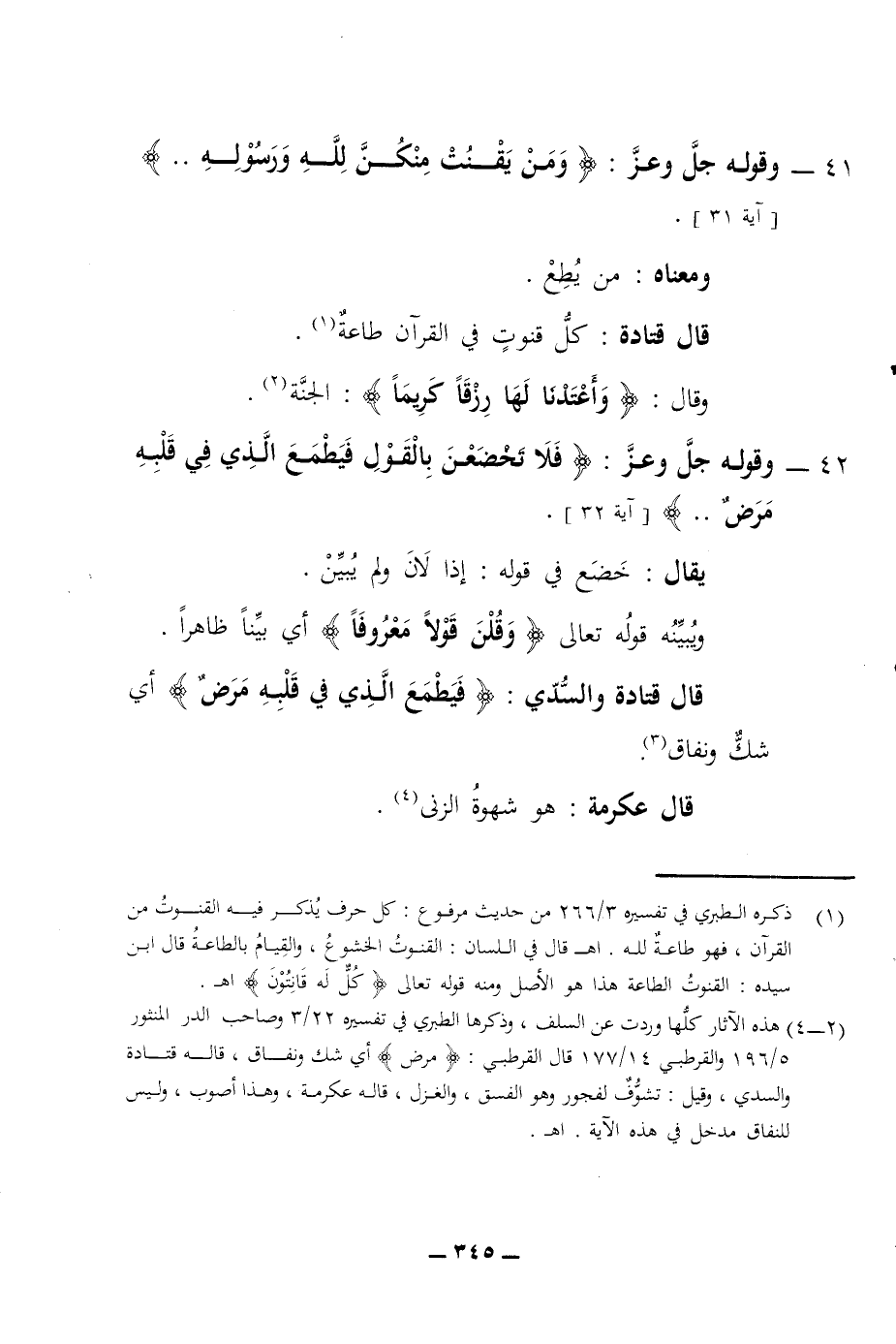 41 - وقوله جل وعز ومن يقنت منكن لله ورسوله ومعناه من يطع قال قتادة كل قنوت في القرآن طاعة وقال وأعتدنا لها رزقا كريما الجنة 42 - وقوله جل وعز فلا تخضعن بالقول فيطمع الذي في قلبه مرض آية 32 يقال خضع في قوله إذا لان ولم يبين ويبينه قوله تعالى ي وقلن قولا معروفا أي بينا ظاهرا قال قتادة والسدي فيطمع الذي في قلبه مرض أي شك ونفاق قال عكرمة هو شهوة الزنى