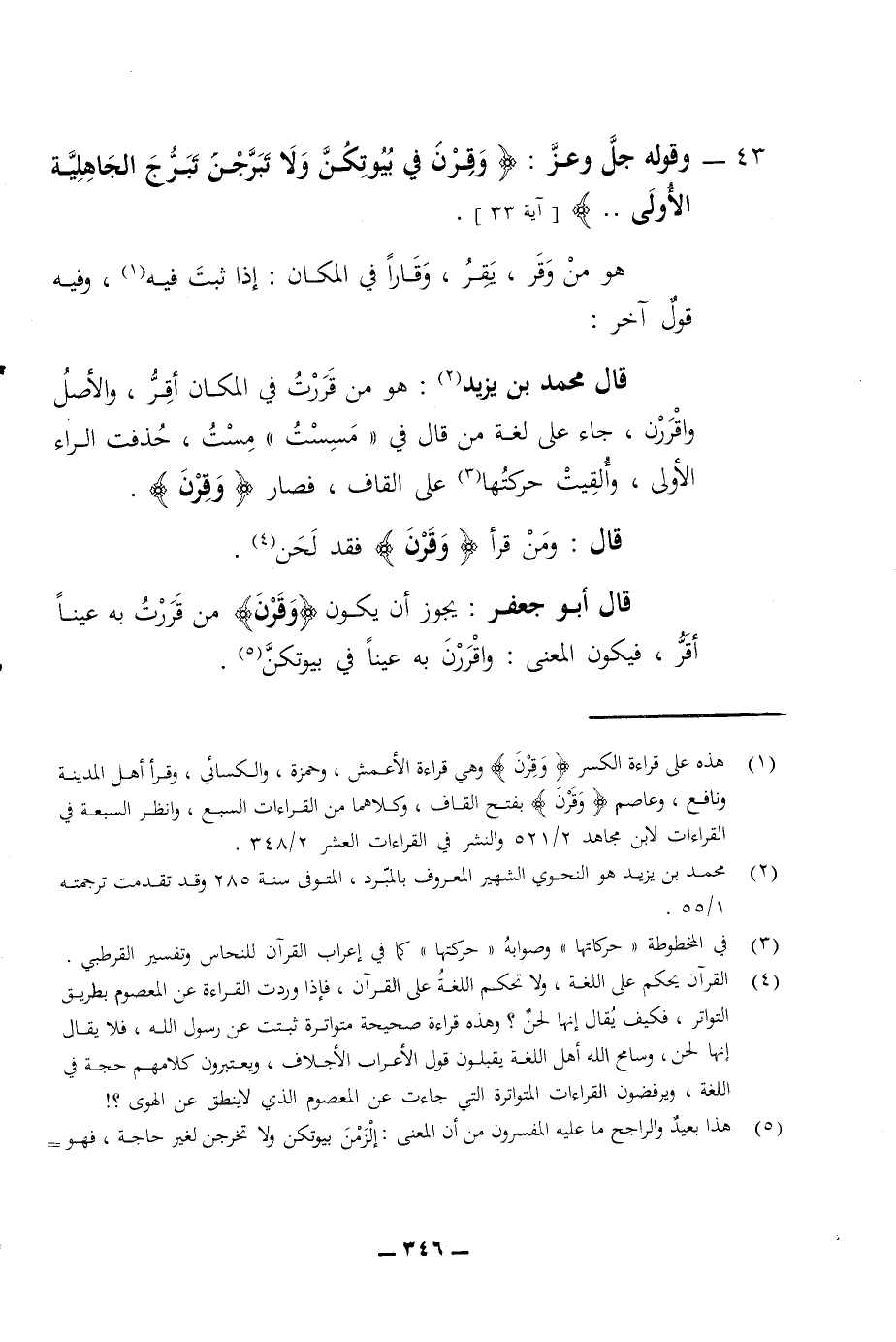 43 - وقوله جل وعز وقرن في بيوتكن ولا تبرجن تبرج الجاهلية الأولى هو من وقر يقر وقارا في المكان إذا ثبت فيه وفيه قول آخر قال محمد بن يزيد هو من قررت في المكان أقر والأصل واقررن جاء على لغة من قال في مسست مست حذفت الراء