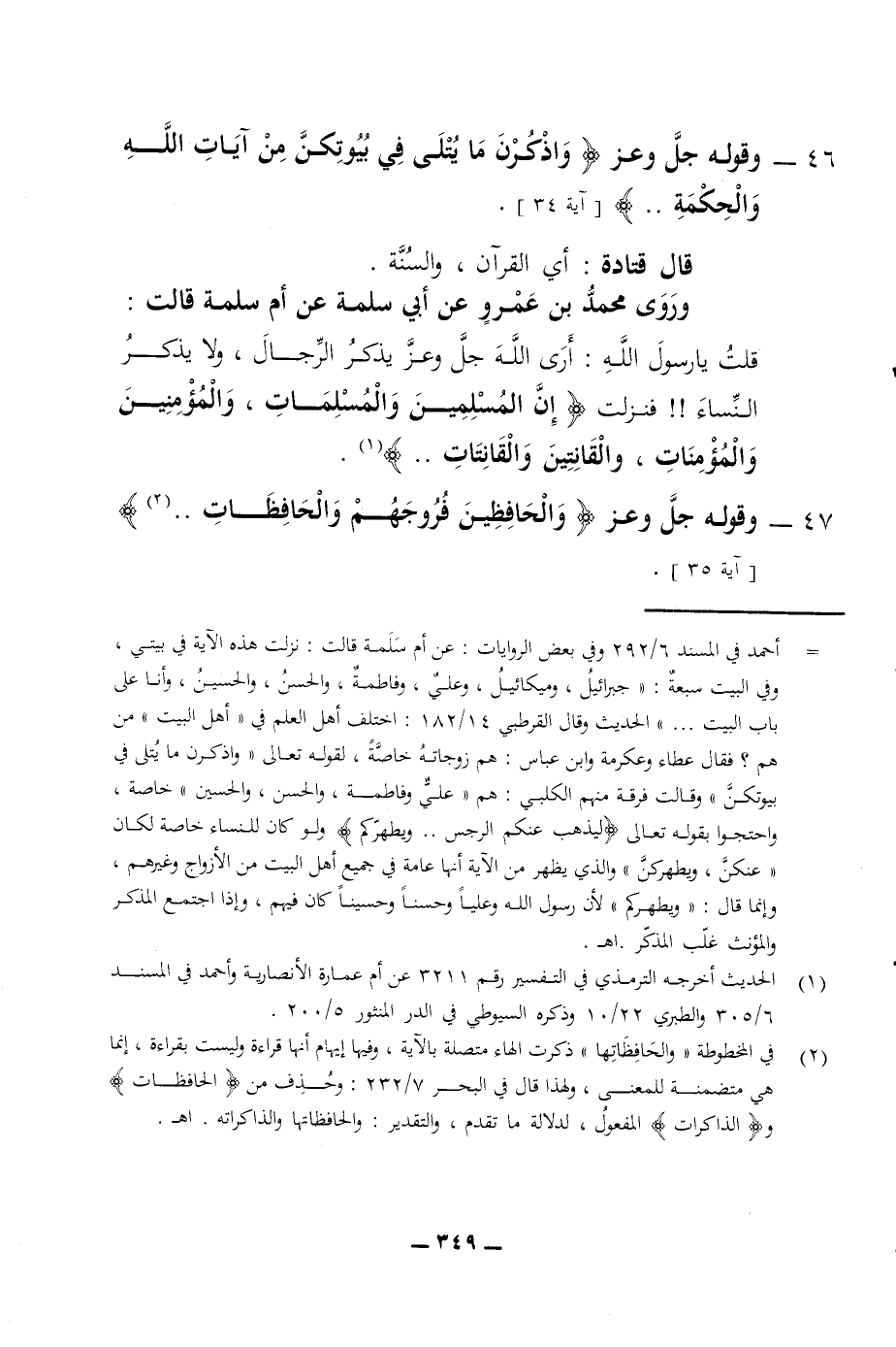 46 - وقوله جل وعز واذكرن ما يتلى في بيوتكن من آيات الله والحكمة آية 34 قال قتادة أي القرآن والسنة وروى محمد بن عمرو عن أبي سلمة عن أم سلمة قالت قلت يا رسول الله أرى الله جل وعز يذكر الرجال ولا يذكر النساء فنزلت إن المسلمين والمسلمات والمؤمنين والمؤمنات والقانتين والقانتات 47 - وقوله جل وعز والحافظين فروجهم والحافظات آية 35