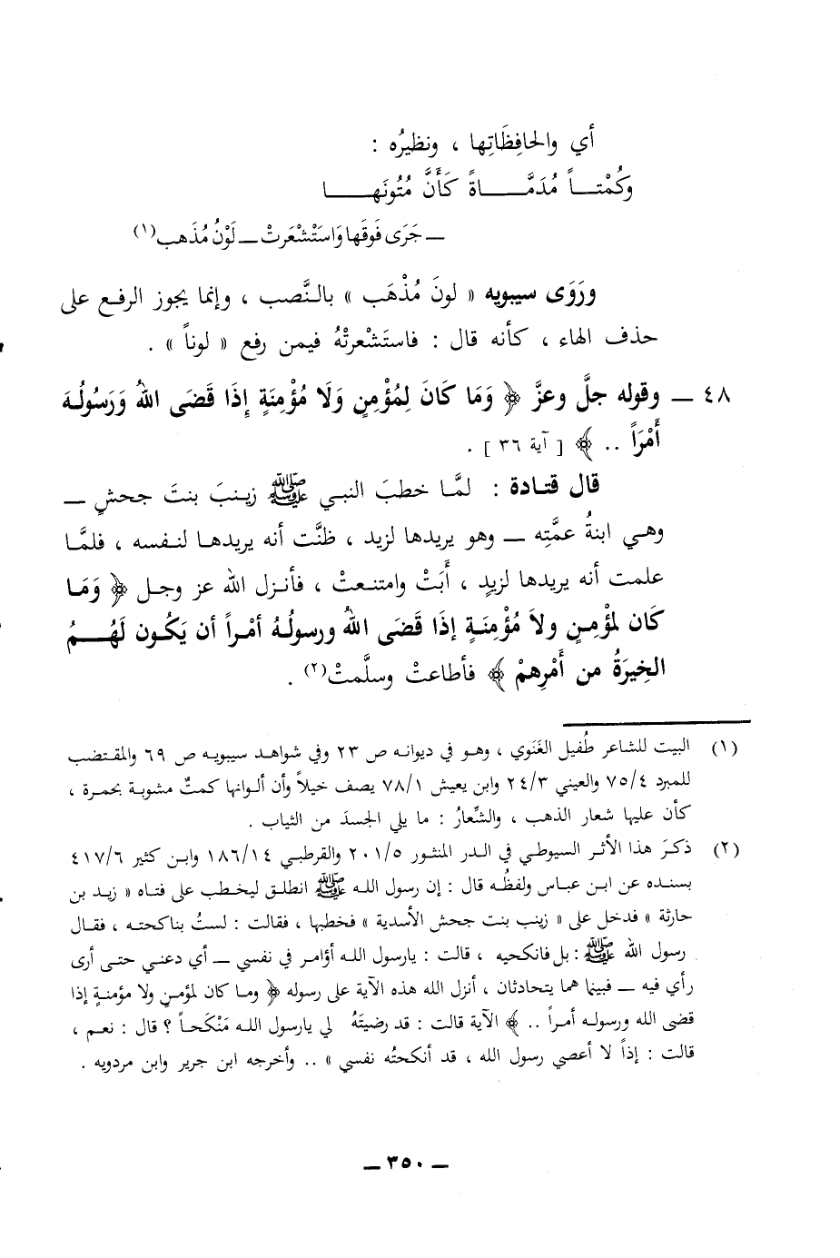 أي والحافظاتها ونظيره وكمتا مدماة كأن متونها جرى فوقها واستشعرت لون المذهب مذهب وروى سيبويه لوت مذهب بالنصب وإنما يجوز الرفع على حذف الهاء كأنه قال فاستشعرته تعالى فيمن رفع لونا 48 - وقوله جل وعز وما كان لمؤمن ولا مؤمنة إذا قضى الله ورسوله