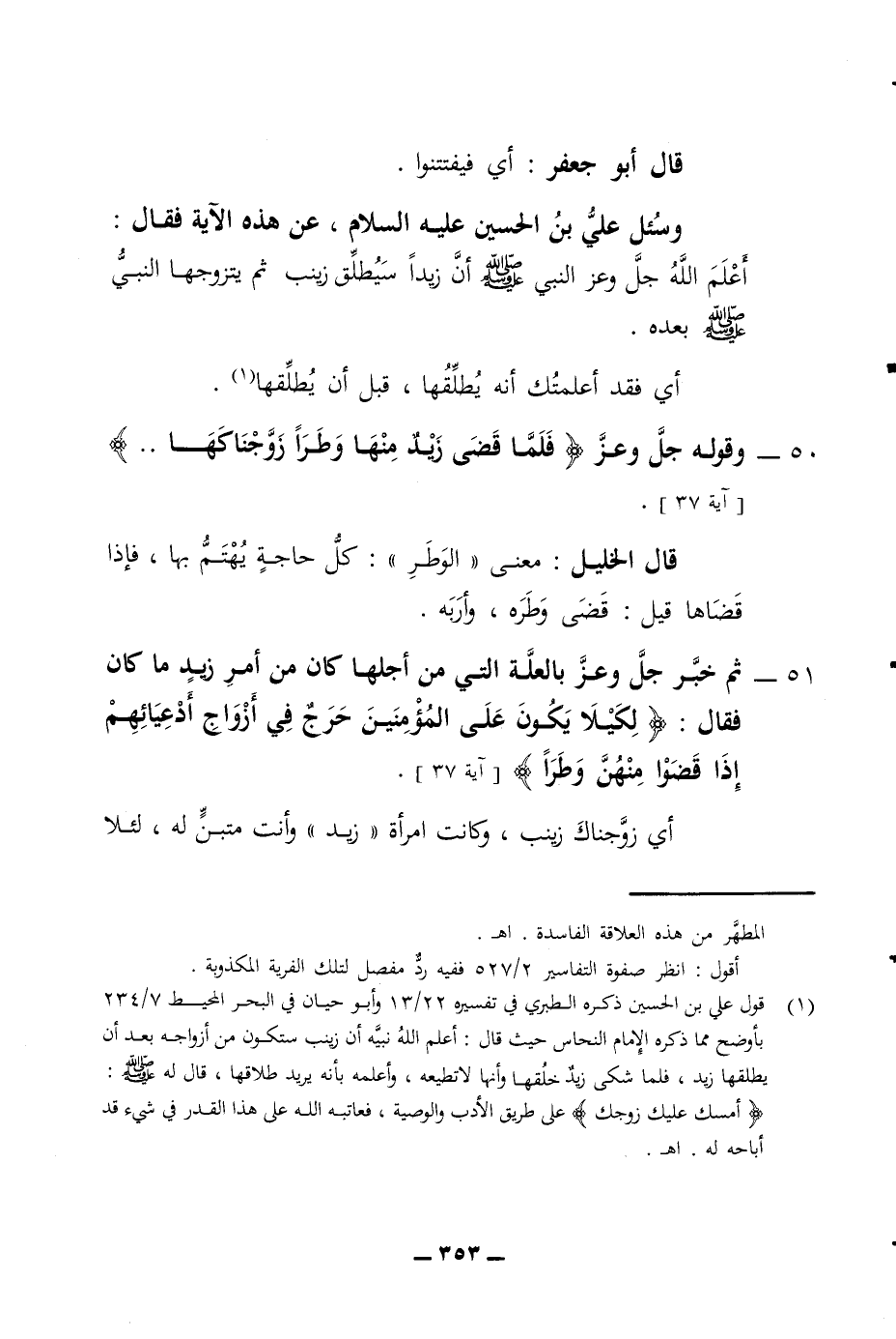 قال أبو جعفر أي فيفتتنوا وسئل علي بن الحسين عليه السلام عن هذه الآية فقال أعلم الله جل وعز النبي صلى الله عليه وسلم أن زيدا سيطلق زينب ثم يتزوجها النبي صلى الله عليه وسلم بعده أي فقد أعلمتك أنه يطلقها قبل أن يطلقها 50 - وقوله جل وعز فلما قضى زيد منها وطرا زوجناكها آية 37 قال الخليل معنى الوطر كل حاجة يهتم بها فإذا قضاها قيل قضى وطره وأربه 51 - ثم خبر جل وعز بالعلة التي من أجلها كان من أمر زيد ما كان فقال لكيلا يكون على المؤمنين حرج في أزواج أدعيائهم إذا قضوا منهن وطرا أي زوجناك زينب وكانت امرأة زيد وأنت متبن فإن له لئلا