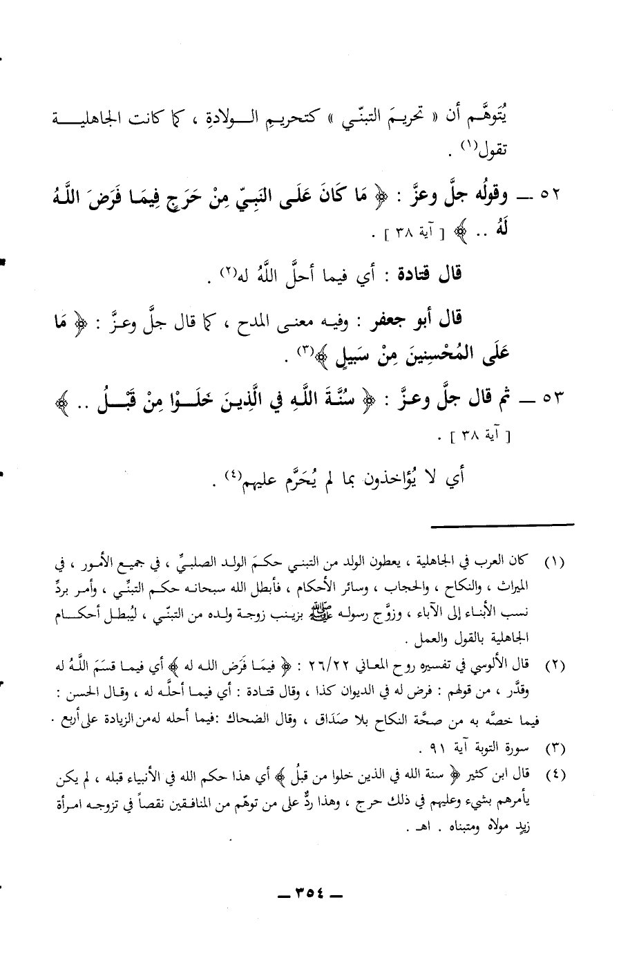 يتوهم أن تحريم التبني كتحريم الولادة كما كانت الجاهلية تقول 52 - وقوله جل وعز ما كان على النبي من حرج فيما فرض الله له آية 38 قال قتادة أي فيما أحل الله له