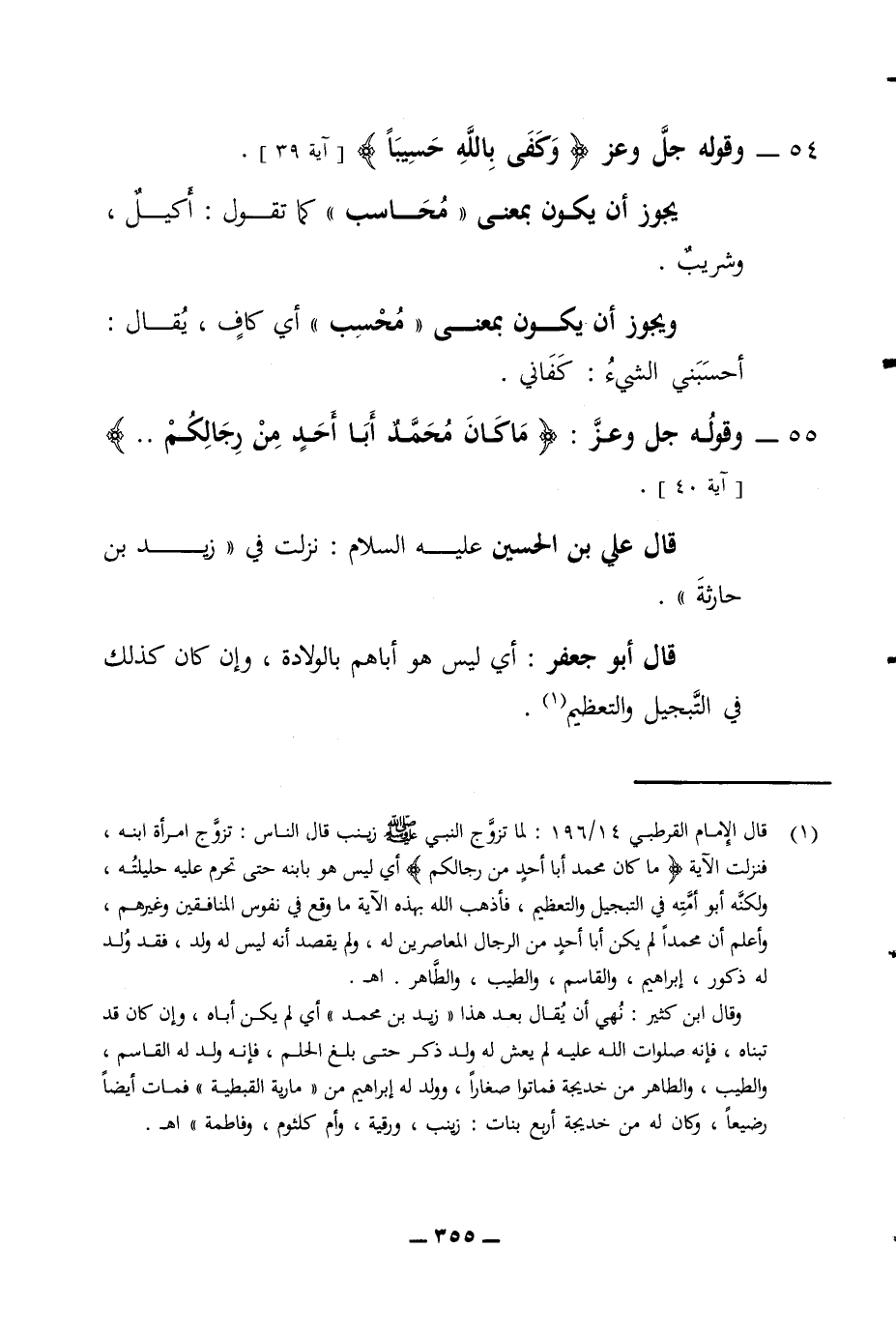 54 - وقوله جل وعز وكفى بالله حسيبا آية 39 يجوز أن يكون بمعنى محاسب كما تقول أكيل وشريب ويجوز أن يكون بمعنى محسب أي كاف يقال أحسبني الشئ كفاني 55 - وقوله جل وعز ما كان محمد أبا أحد من رجالكم آية 40 قال علي بن الحسين عليه السلام نزلت في زيد بن حارثة قال أبو جعفر أي ليس هو أباهم بالولادة وإن كان كذلك في التبجيل والتعظيم