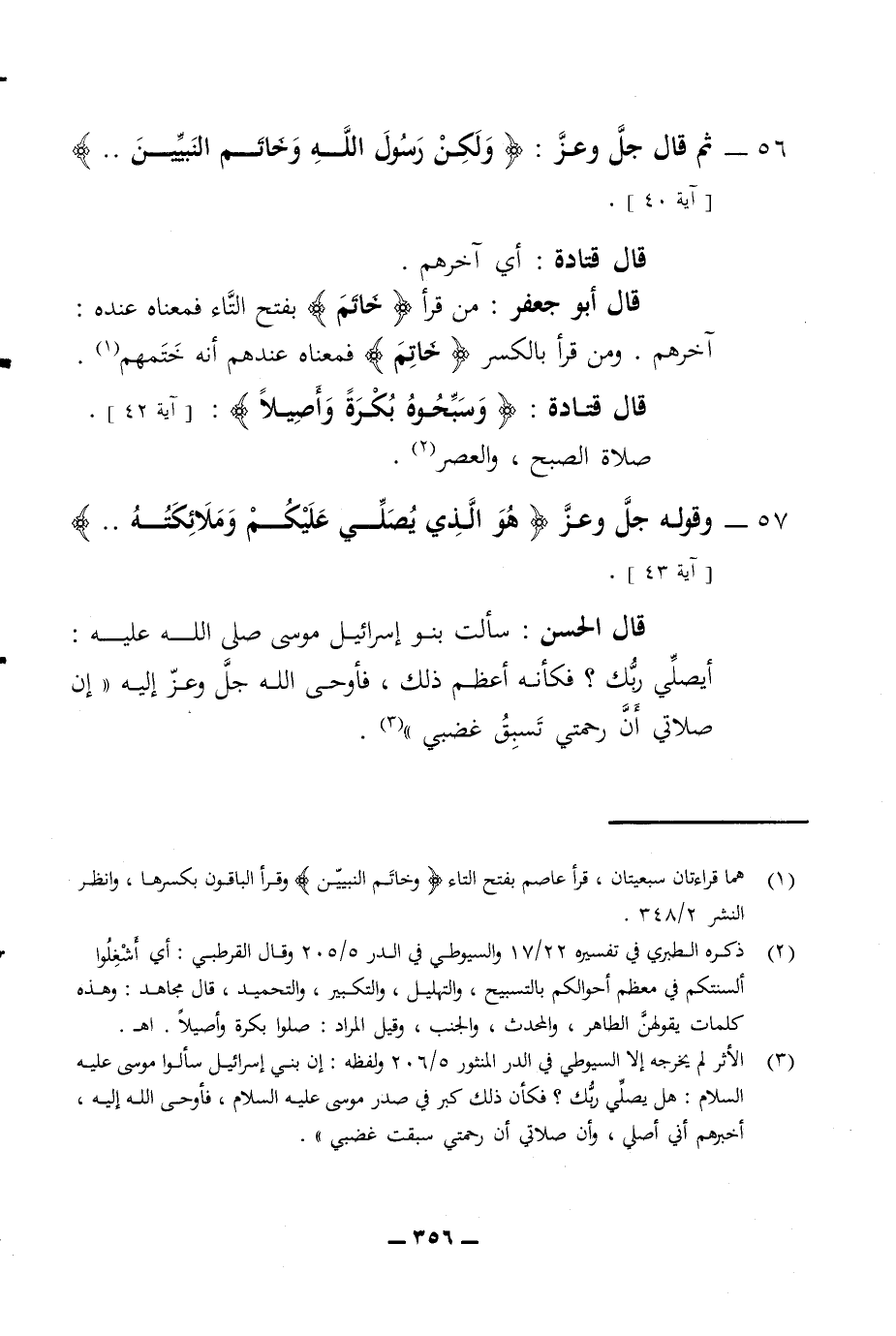 قال قتادة وسبحوه بكرة وأصيلا آية 42 صلاة الصبح والعصر 57 - وقوله جل وعز هو الذي يصلي عليكم وملائكته آية 43 قال الحسن سألت بنو إسرائيل موسى صلى الله عليه أيصلي ربك فكأنه أعظم ذلك فأوحى الله جل وعز إليه إن صلاتي أن رحمتي تسبق غضبي