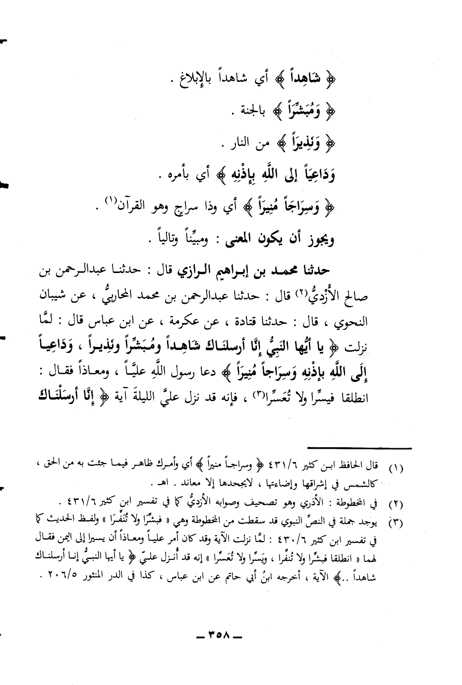 وسراجا منيرا أي وذا سراج وهو القرآن ويجوز أن يكون المعنى ومبينا وتاليا حدثنا محمد بن إبراهيم الرازي قال حدثنا عبد الرحمن بن صالح الأزدي قال حدثنا عبد الرحمن بن محمد المحاربي عن شيبان النحوي قال حدثنا قتادة عن عكرمة عن ابن عباس قال لما نزلت يا أيها النبي إنا أرسلناك شاهدا ومبشرا ونذيرا وداعيا إلى الله بإذنه وسراجا منيرا دعا رسول الله عليا ومعاذا فقال انطلقا فيسرا ولا تعسرا فإنه قد نزل علي الليلة آية إنا أرسلناك